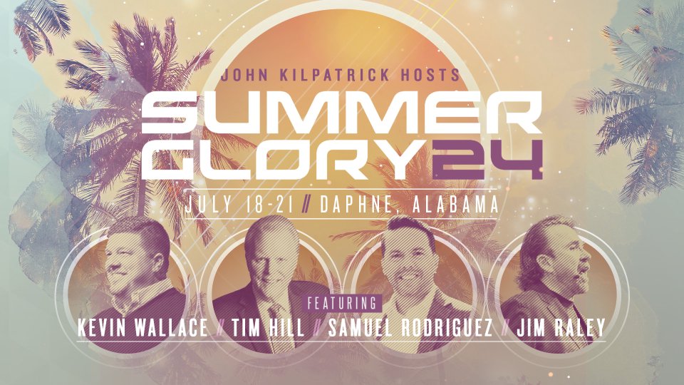 Summer Glory 2024 with Samuel Rodriguez, Kevin Wallace, Jim Raley, and Tim Hill; hosted by John Kilpatrick • Conference Times - Thursday 7 PM / Friday 10 AM & 7 PM / Saturday 10 AM & 6 PM / Sunday 10 AM • FREE REGISTRATION REQUIRED (Registration does not guarantee a seat in the sanctuary. Seating is first-come, first-served, with additional overflow seating. Doors open 1 hour before each session.) • No childcare provided. • Services will be live-streamed. Services will not be archived.