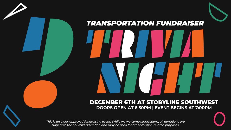 Mark your calendars for Saturday, December 6th at Storyline Southwest Church in Lindenwood Park, where we’re having a trivia night and dessert auction fundraiser for our missionaries to purchase a vehicle.