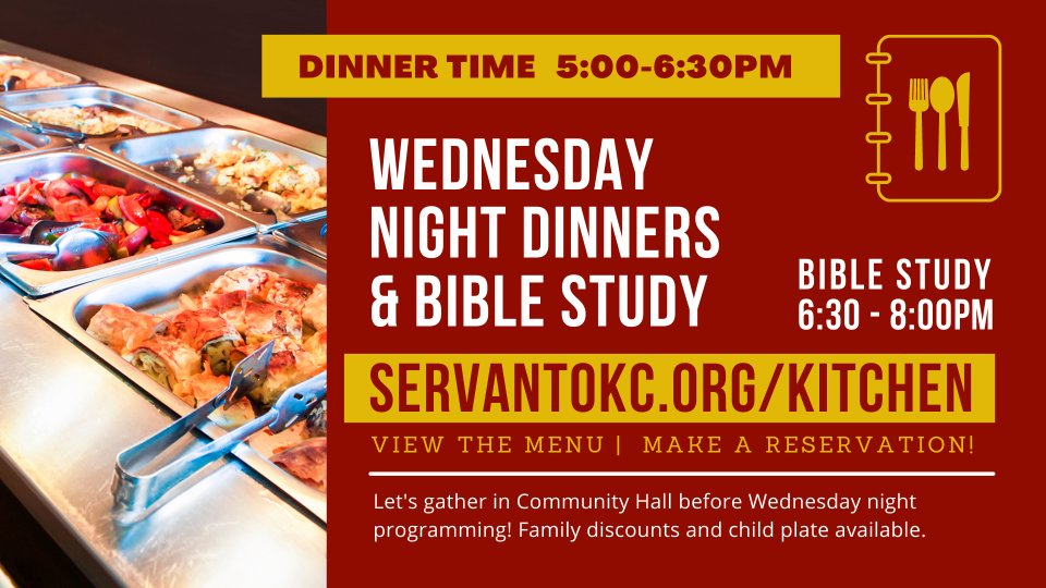 The Servant Kitchen is now open for Wednesday night dinners - 5:00-6:30pm. Reservations are encouraged for Wednesday night meals. To view the menu and make reservations, go to ServantOKC.org/KITCHEN. Immediately following Wednesday night meal time (6:30-8:00pm), Dr. Matthew Mitchell will lead a Bible study for adults (men and women) in Community Hall. No reservation necessary for Bible study. All are welcome.