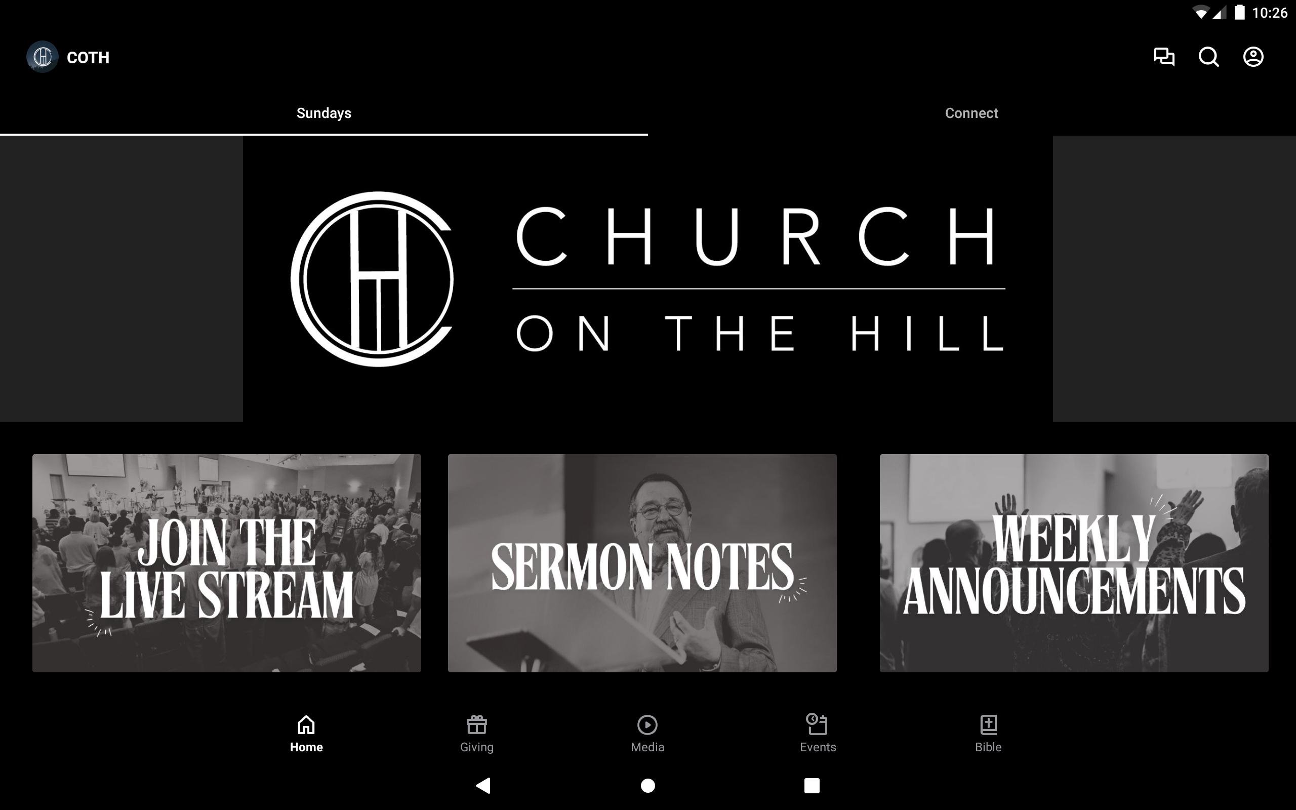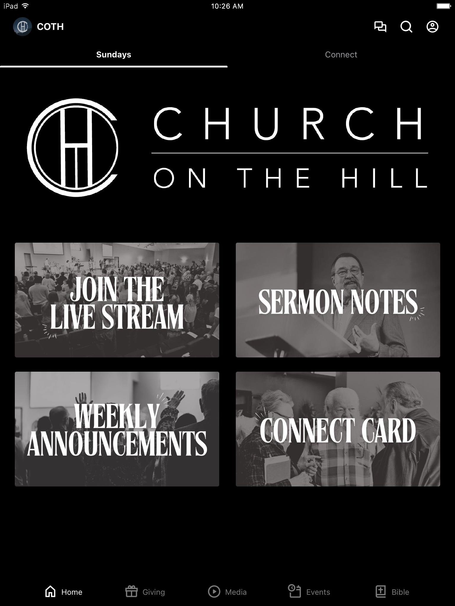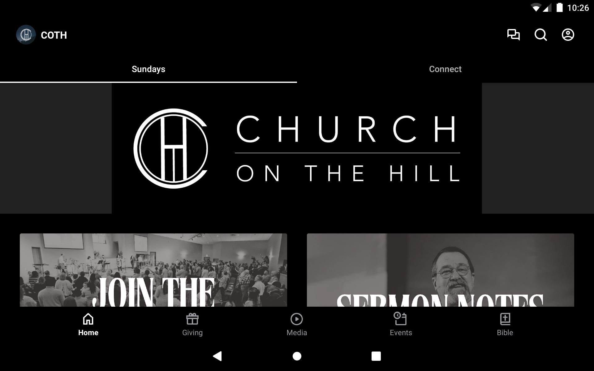 An app for Church On The Hill, a Church for all people! Connect with us. This app will help to connect you to all aspects of COTH. -Who and Where we are -LiveStream and Past Sermons -Sermons Notes -Current and Upcoming Events with Signups -COTH Giving