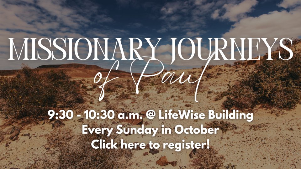 Want to dive deeper into the missionary journeys Paul takes in the book of Acts? This study is for you! On Sundays during first service in October, Dean Peters will be leading a bible study on the missionary journeys of Paul. This class will take place down the street at the Eventful building from 9:30-10:30a on 10/5, 10/12, 10/19, and 10/26. Kids can be checked into KidCity before heading over. Coffee provided.
