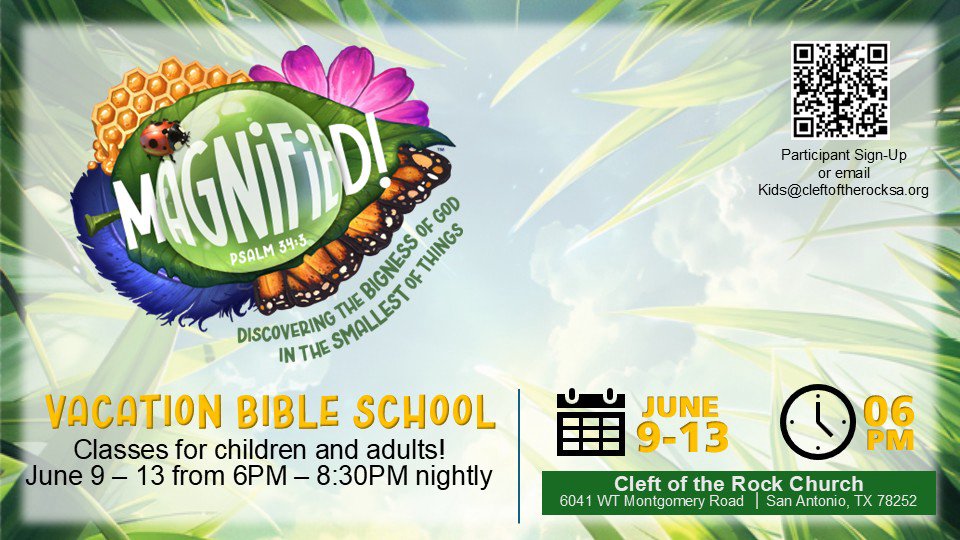 Magnified!™ VBS will encourage us all to look closely at the details of God’s amazing world and magnify, or proclaim, the greatness of God. God made us, cares about us, loves us, forgives us, and is faithful to keep all His promises to us. We will praise God together! We were made to magnify God!