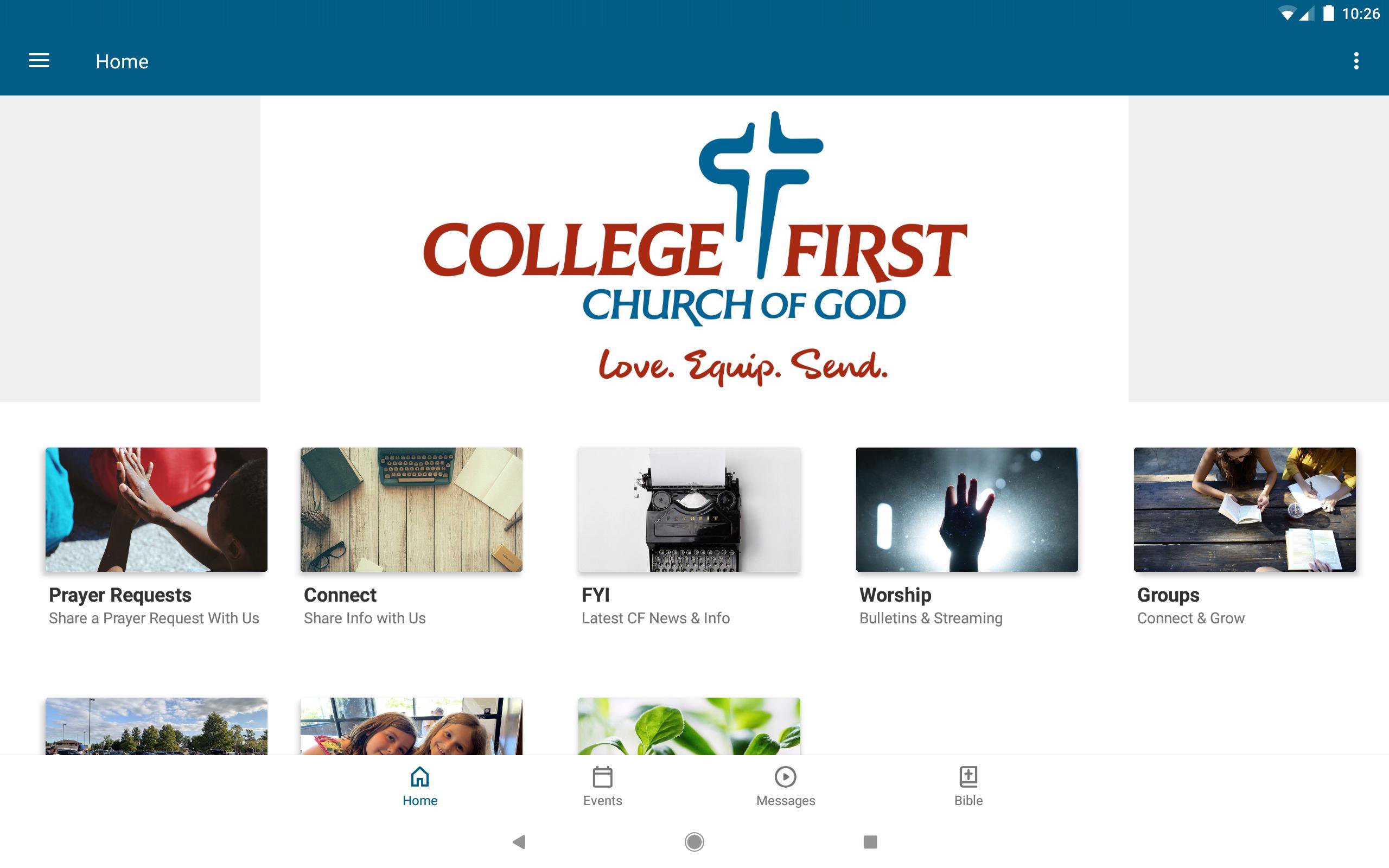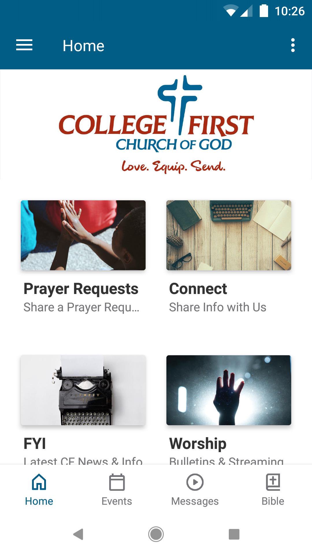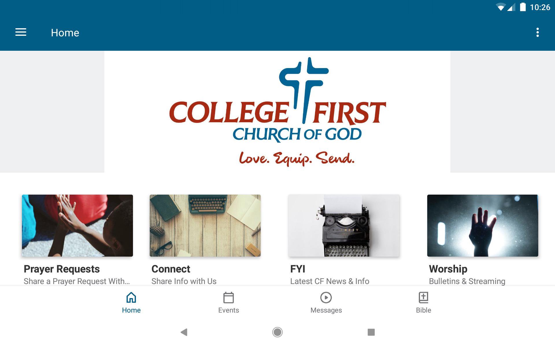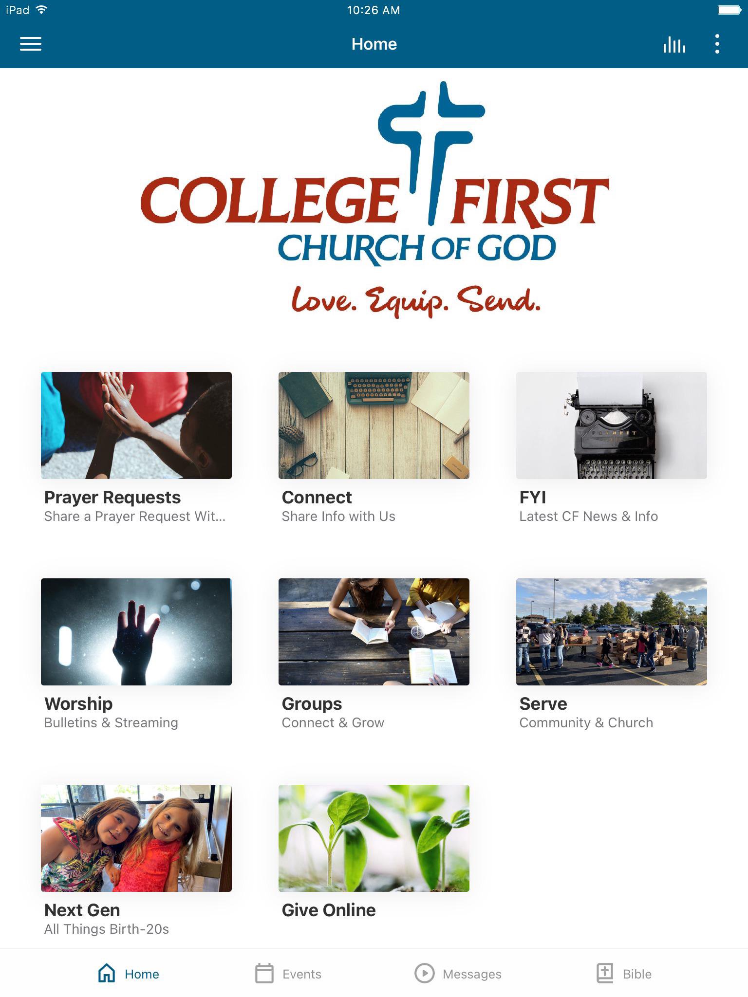 The College First app will help you get and stay connected with the day-to-day life of our church. With this app you can: - Watch or listen to past messages - Stay up to date with push notifications - Share prayer requests - Give online - Find a group - See major events