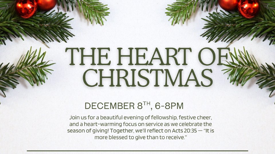 Join us for a beautiful evening of fellowship, festive cheer, and a heart-warming focus on service as we celebrate the season of giving! Together, we’ll reflect on Acts 20:35 — “It is more blessed to give than to receive.”