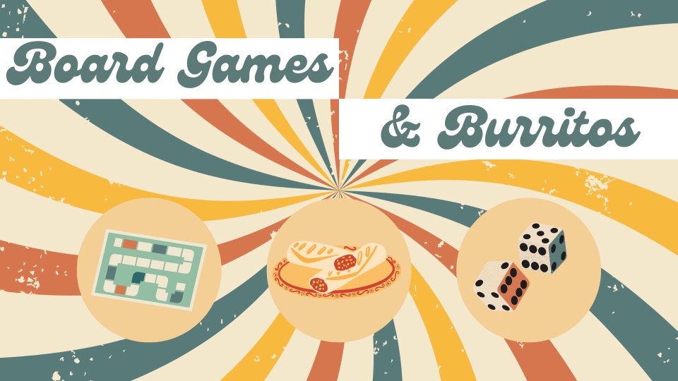Cost is $5 if you want to order a burrito, but the event is free if you want to bring your own food! Meet new people, play fun games, and eat delicious food at our first ever Board Games & Burritos night! We will order burritos from Santiago's (one option will be vegetarian) as well as chips and salsa. Bring your own drink and your favorite game!