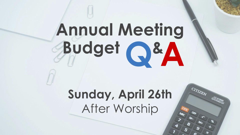 We strive for full transparency, keeping our membership informed before the Annual Meeting on May 17th. Join us for a Q&A about the upcoming budget and get questions answered before the Annual Meeting. We will meet for 15-20 minutes after the worship services on April 26th.