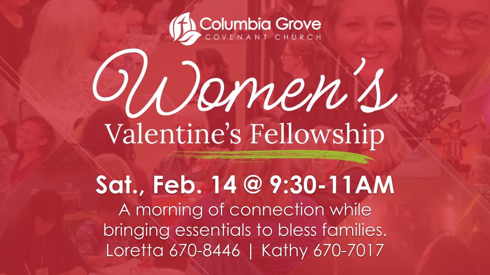 Join us for our next Women’s Gathering at Columbia Grove Church on Friday, February 14, from 9:30–11:00 AM.