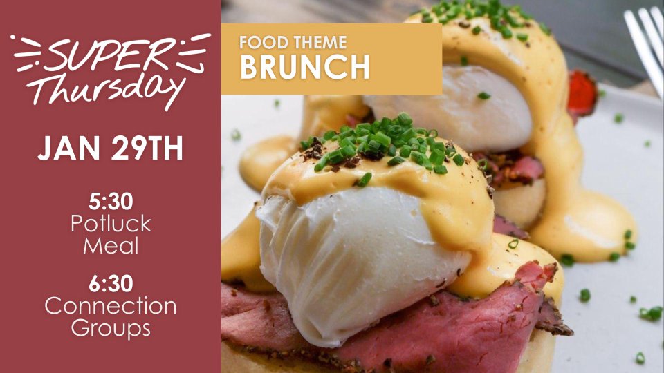 Enjoy an all-church meal at 5:30. This week's food theme is "Brunch."