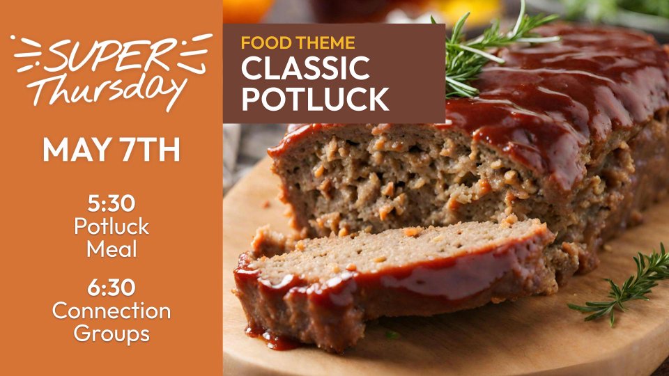 Enjoy an all-church meal at 5:30. This week's food theme is "Classic Potluck"