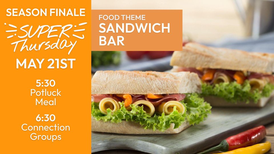 Enjoy an all-church meal at 5:30. This week's food theme is "Sandwich Bar."