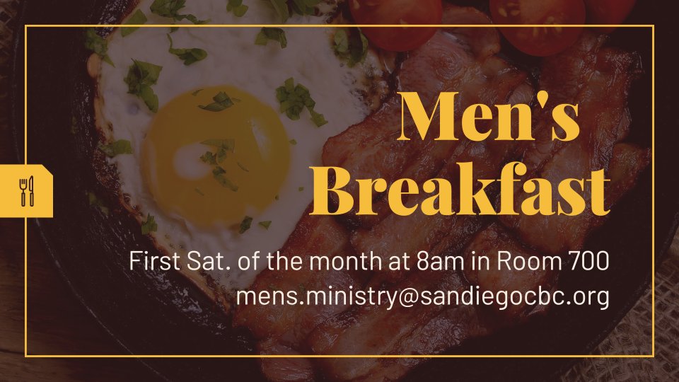 Join us for the first Saturday of each month for Men's Breakfast, fellowship and Prayer! start time: 8am, in room 700.