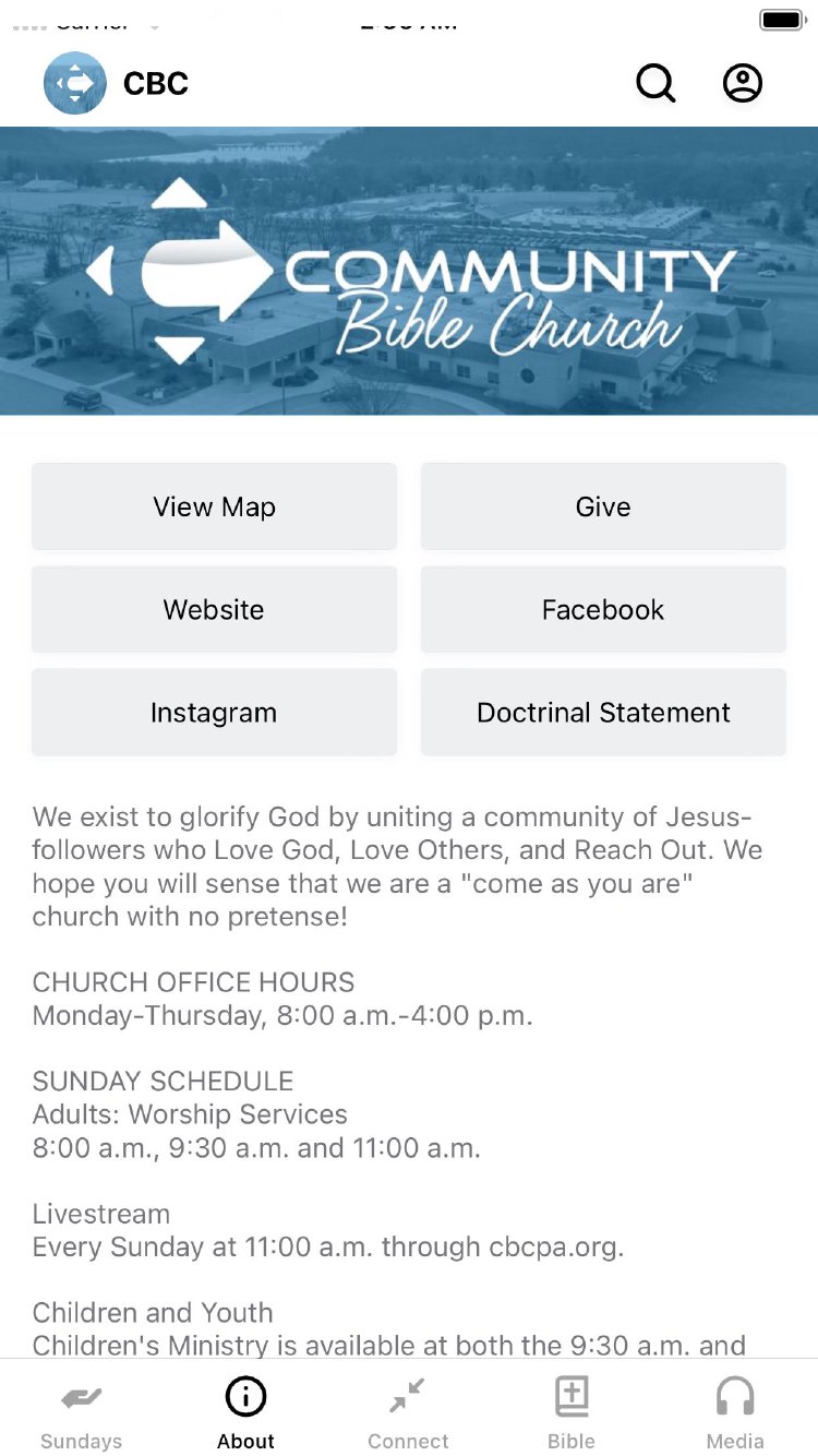 The official Community Bible Church app provides you with easy access to Sunday morning information and content, message series, online giving, and basic church information for CBC in Marietta, PA. -Fill-in sermon notes (download or send them to your email!) -Sermon scripture -Weekly announcements -Prayer requests -Connect card -Online giving -Link to Facebook, Twitter, and Instagram pages -Sermon audio -Daily Bible reading -Ministry info