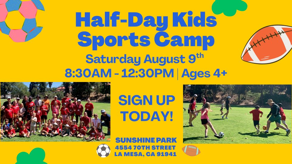 We are excited to be hosting a sports camp for our community! Register your kids (ages 4+ ). Your registration fee will include event activities and a meal for kids and parents at 12PM. Any additional money raised will go towards our Compass Cares ministry which meets needs in the San Diego community including foster care, families in need, those experiencing homelessness and more.