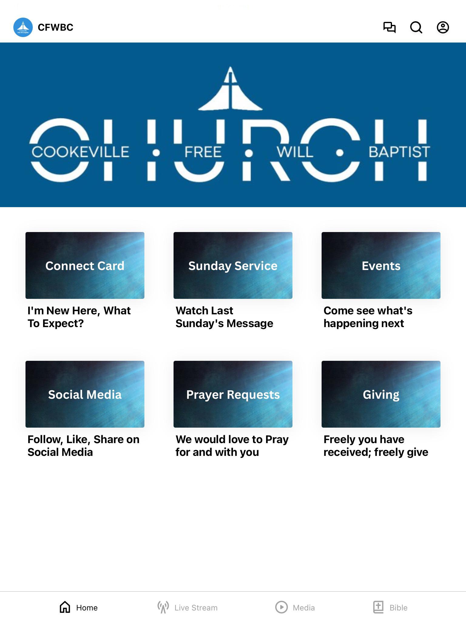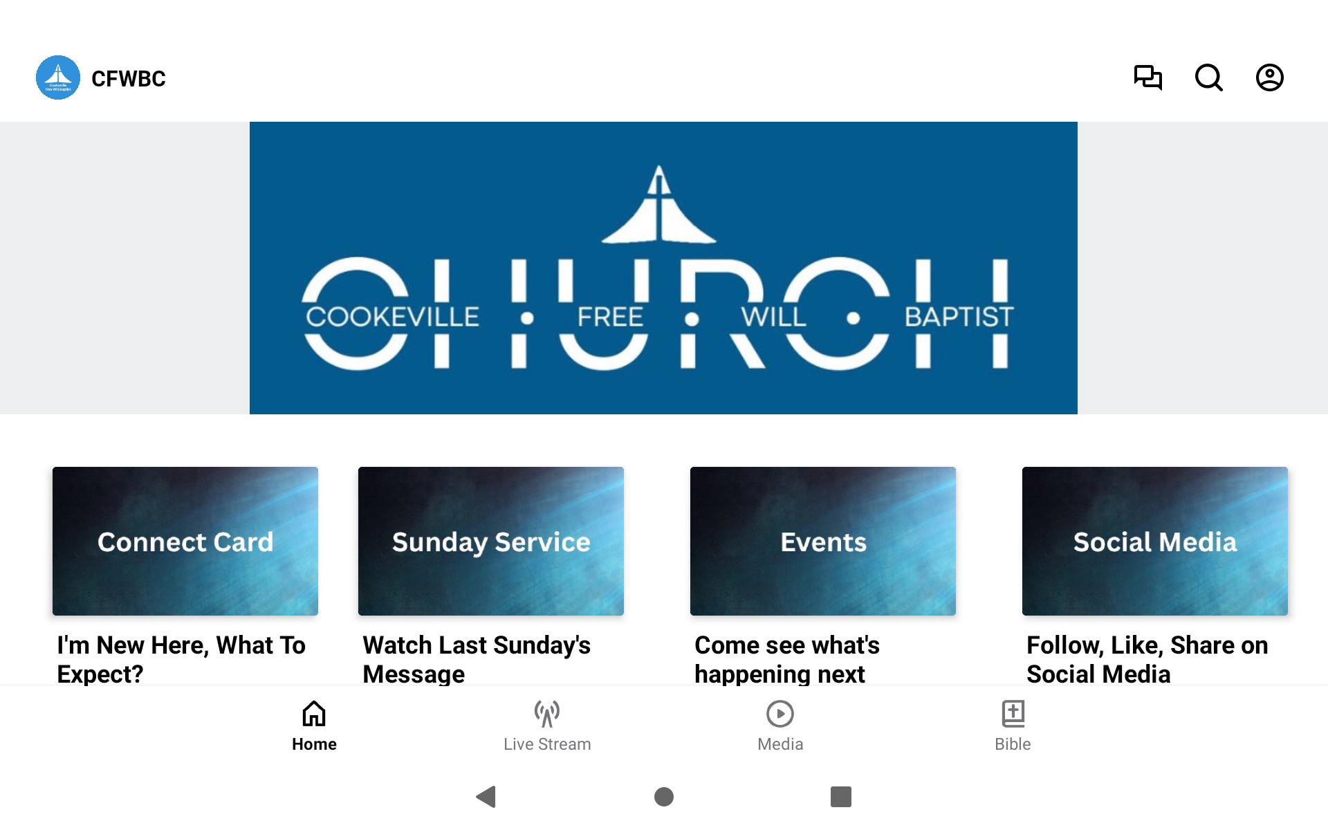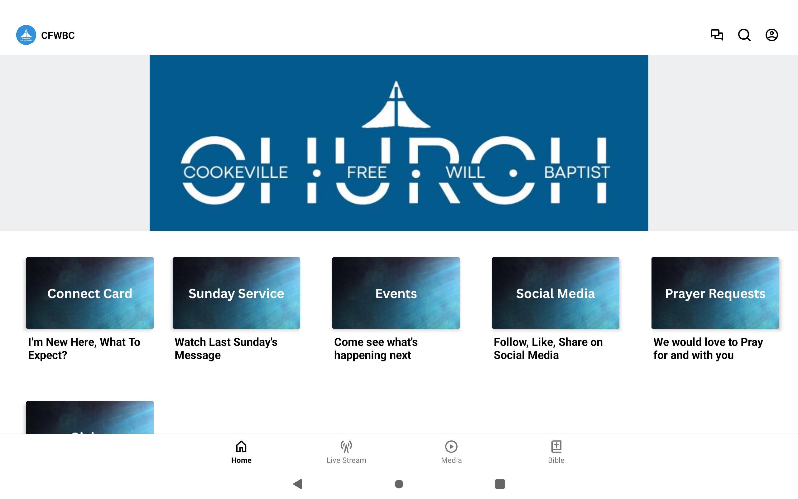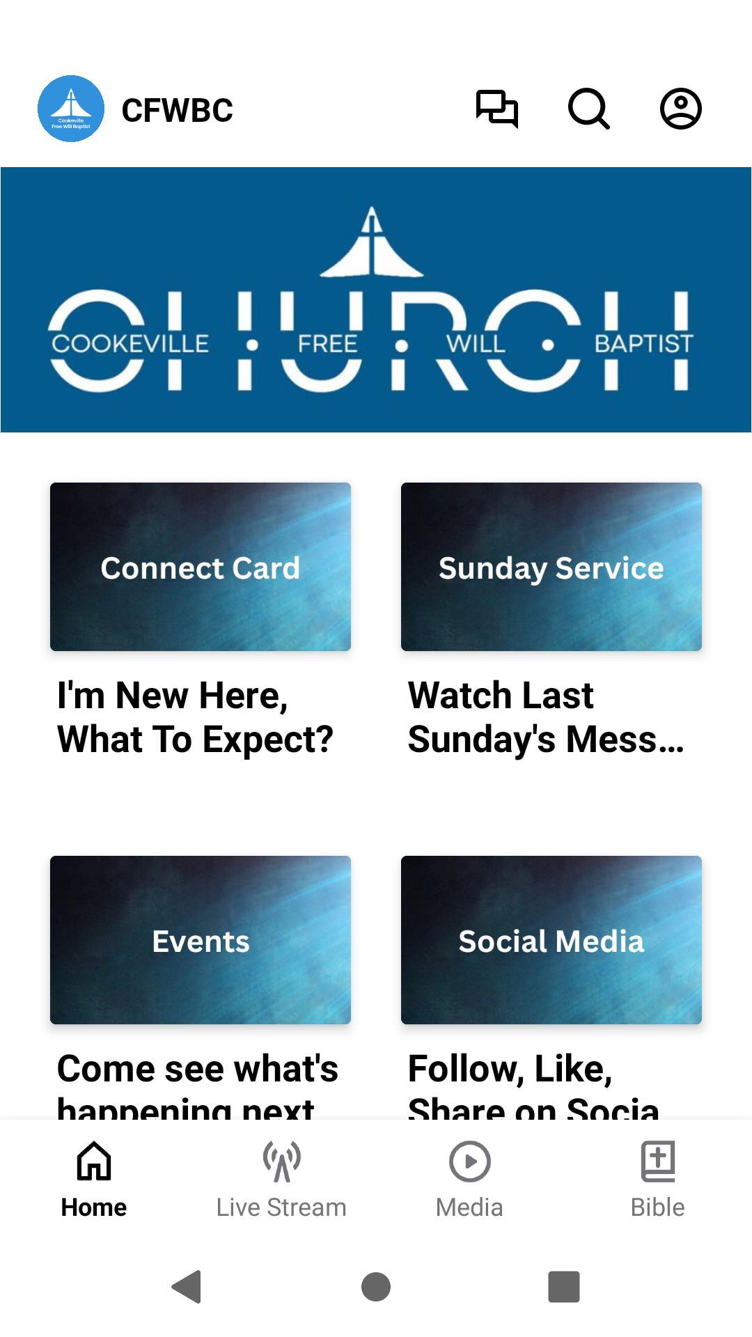Welcome to the CFWBC app! Check out all kinds of interesting content and share it with friends via Facebook, Instagram, YouTube, or email. For more information about CFWBC, please visit www.cfwbc.com This app will help you stay connected to our church. With this app, you can watch or listen to past sermons and tune into a live stream when available.