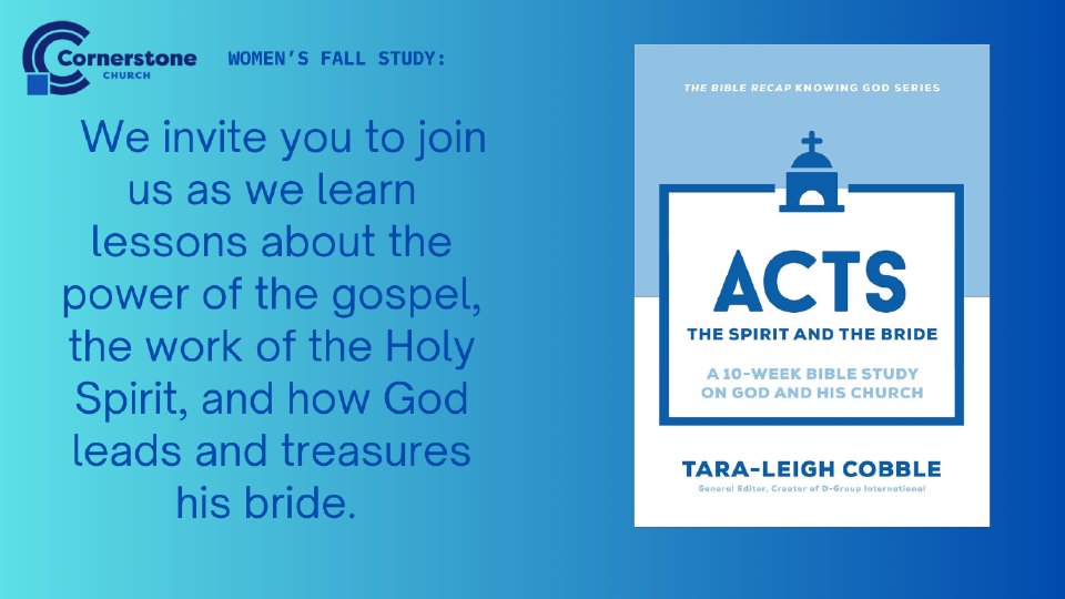 ACTS: The Spirit and The Bride by Tara-Leigh Cobble will be starting the week of September 15th.