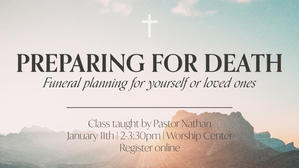 Talking about death isn’t easy, but planning ahead can bring peace to you and those you love. Join Pastor Nathan on Sunday, January 11th from 2:00-3:30PM in the Worship Center for a thoughtful and practical class designed to help you understand and prepare for one of life’s most meaningful transitions.