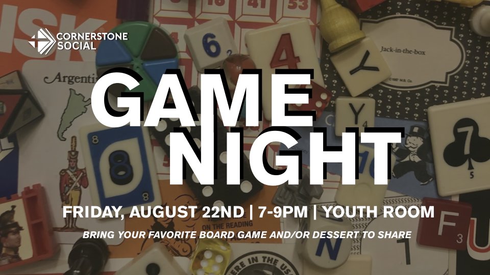 You're invited to a board game night! We'll play games in the youth room (lower level) on Friday, August 22nd from 7:00-9:00PM. We'll have a fun night of friendly competition playing your favorite board games. Bring games and a dessert to share if you can! Be sure to register so we can plan accordingly. Looking forward to seeing you!