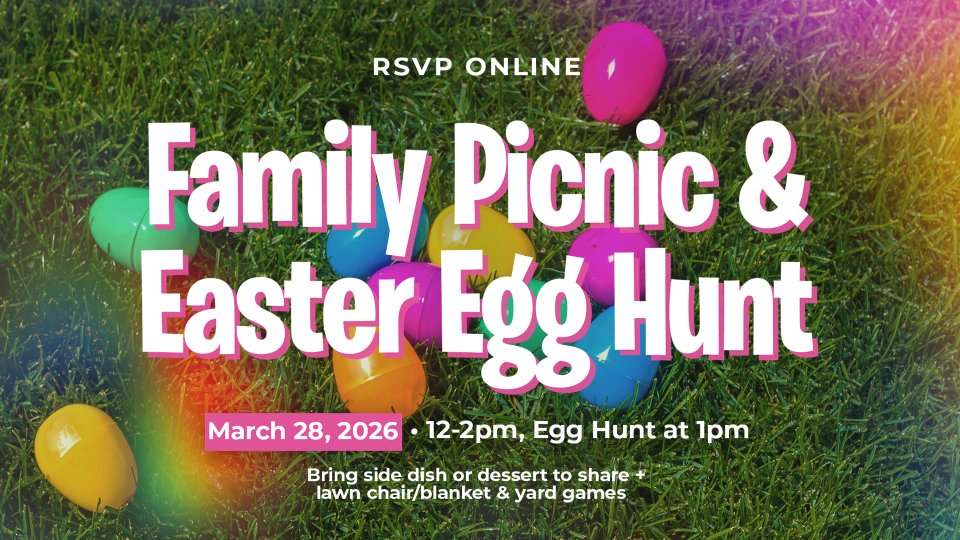Our Family Picnic and Easter Egg Hunt on Saturday, March 28th, from Noon-2:00PM! We'll be grilling out in our backyard, enjoying yard games, and spending time together. Please bring a side dish or dessert to share, plus yard games if you have any!