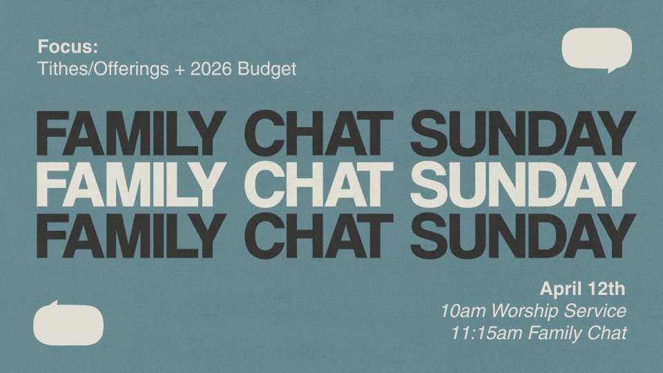 Immediately following our one service at 10AM on April 12th, we're having a family chat! This is a chance for us to get talk together as a church family. The focus of April's chat is tithes and offerings (definitions and differences). We'll also be sharing the 2026 budget. Anyone is welcome to attend; you do not need to be a member to participate. See you there!