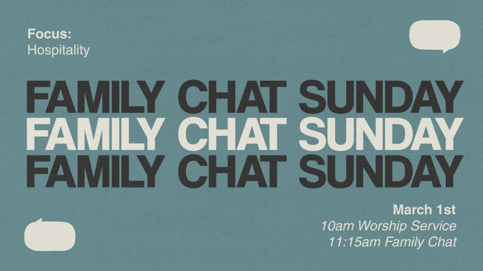 Immediately following our one service at 10AM on March 1st, we're having a family chat! This is a chance for us to get talk together as a church family. The focus will be about hospitality. Anyone is welcome to attend; you do not need to be a member to participate. See you there!