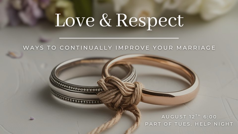 Love & Respect | Ways to Continually Improve Your Marriage is led by Tommy & Dina Tatum. If you are engaged or married this class is for you! Join us every Tuesday HELP Night to learn and gather tools that will surely bless you and your spouse and definitely make your marriage even better!!! Please register for our first class which is launching August 12th.