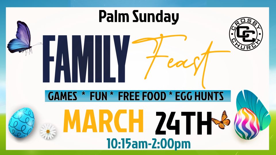 Crosby Church is excited to celebrate Palm Sunday with a Community Feast. Service starts at 10:15am followed by a delightful family picnic, egg hunts and games. Connect with fellow church members and share in the joy of Palm Sunday. Remember to register for the food count so that we can prepare enough for everyone! Come join the celebration, and may this Palm Sunday be filled with blessings, community, and good food!