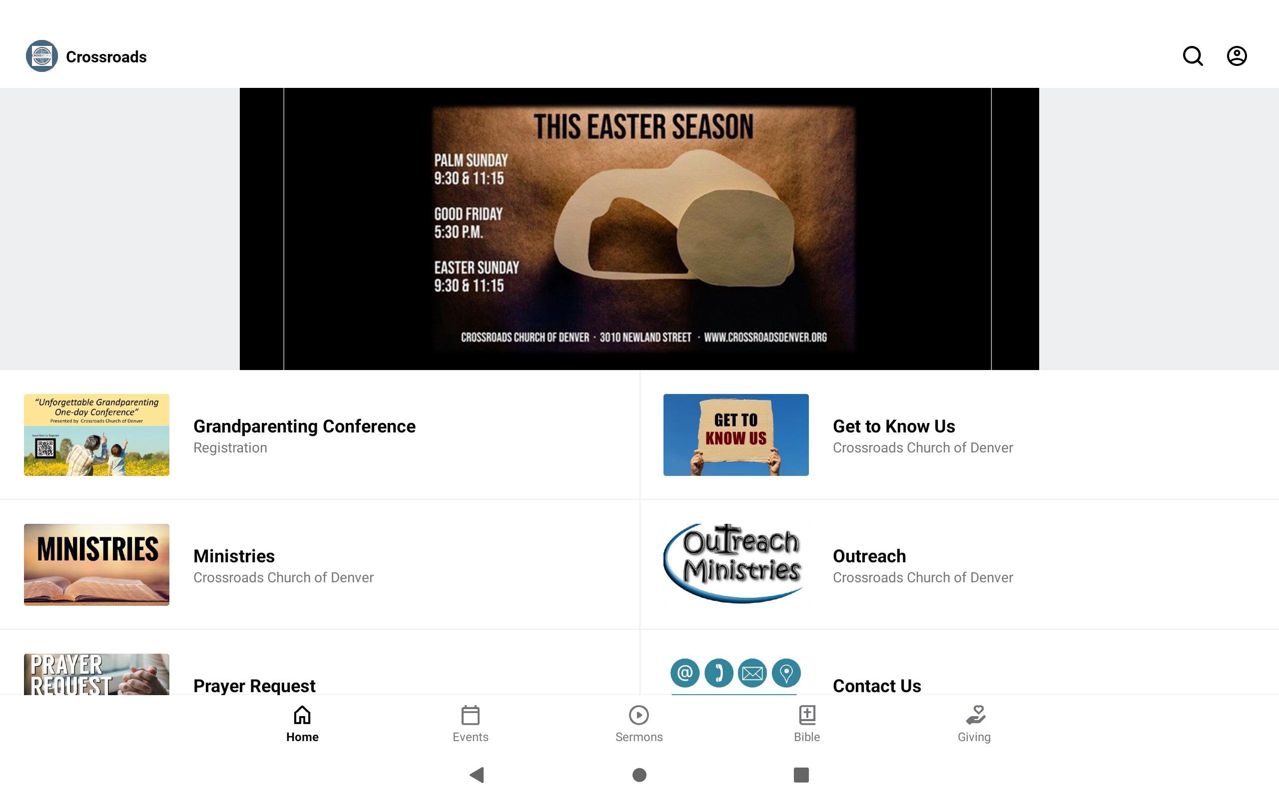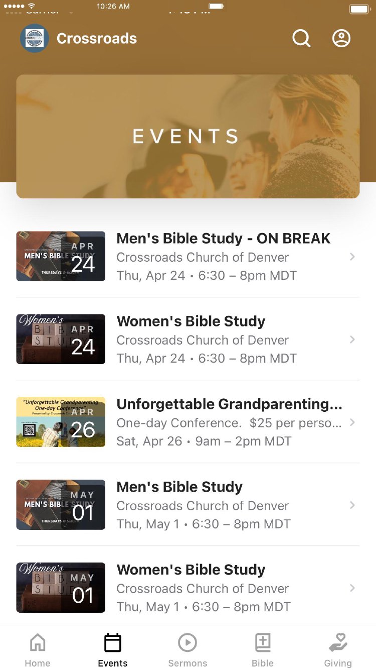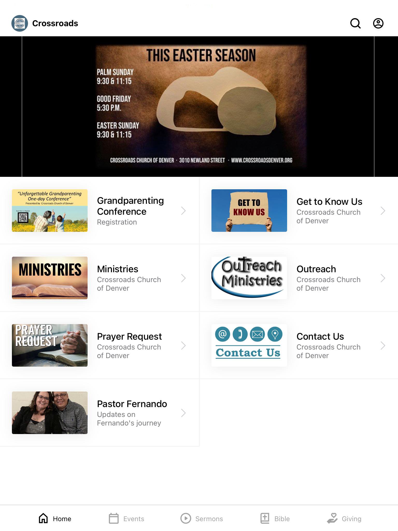 The Crossroad Church of Denver app is packed with powerful content and resources to help you grow and stay connected. With this app you can: - Watch or listen to past messages - Stay up-to-date with push notifications - Download messages for offline listening - Follow along with our Bible Reading Plan - Sign up for events - Make a secure gift