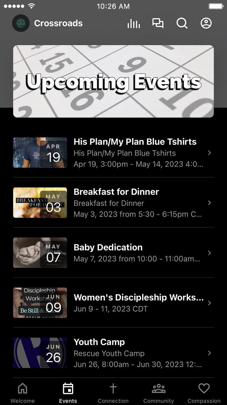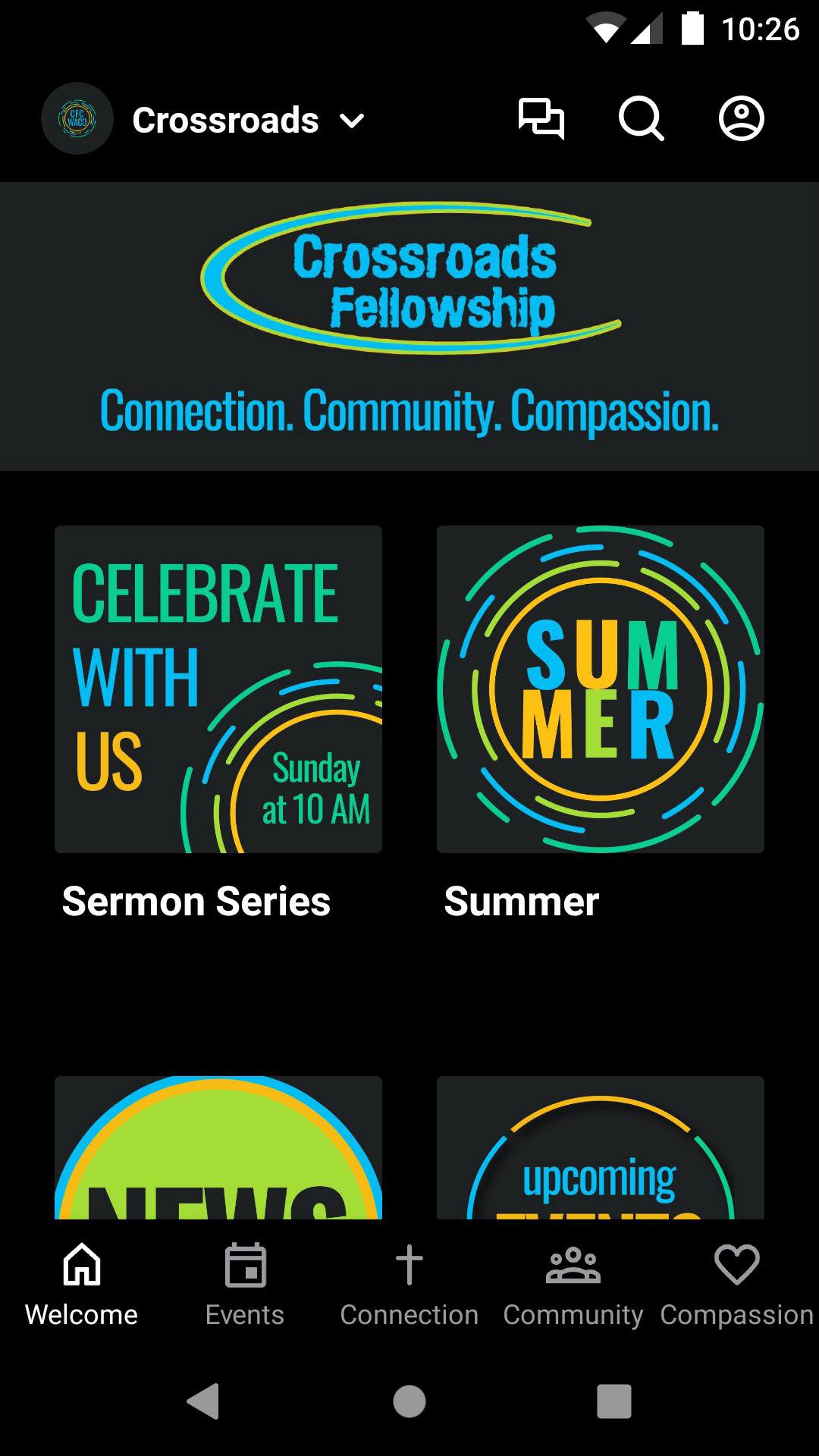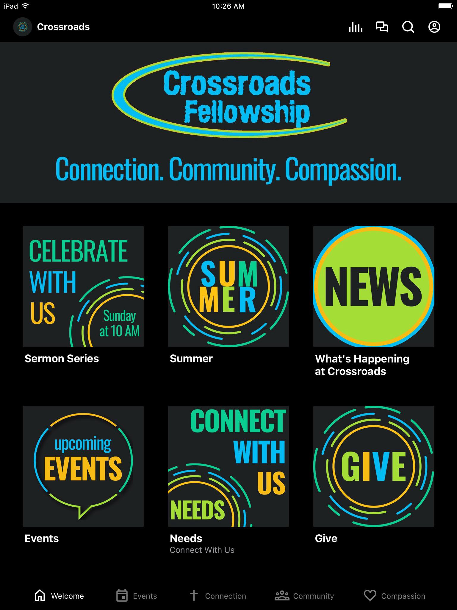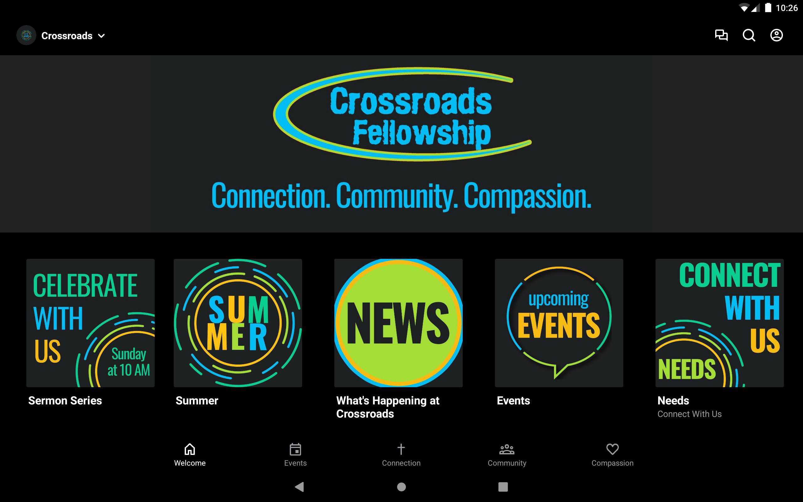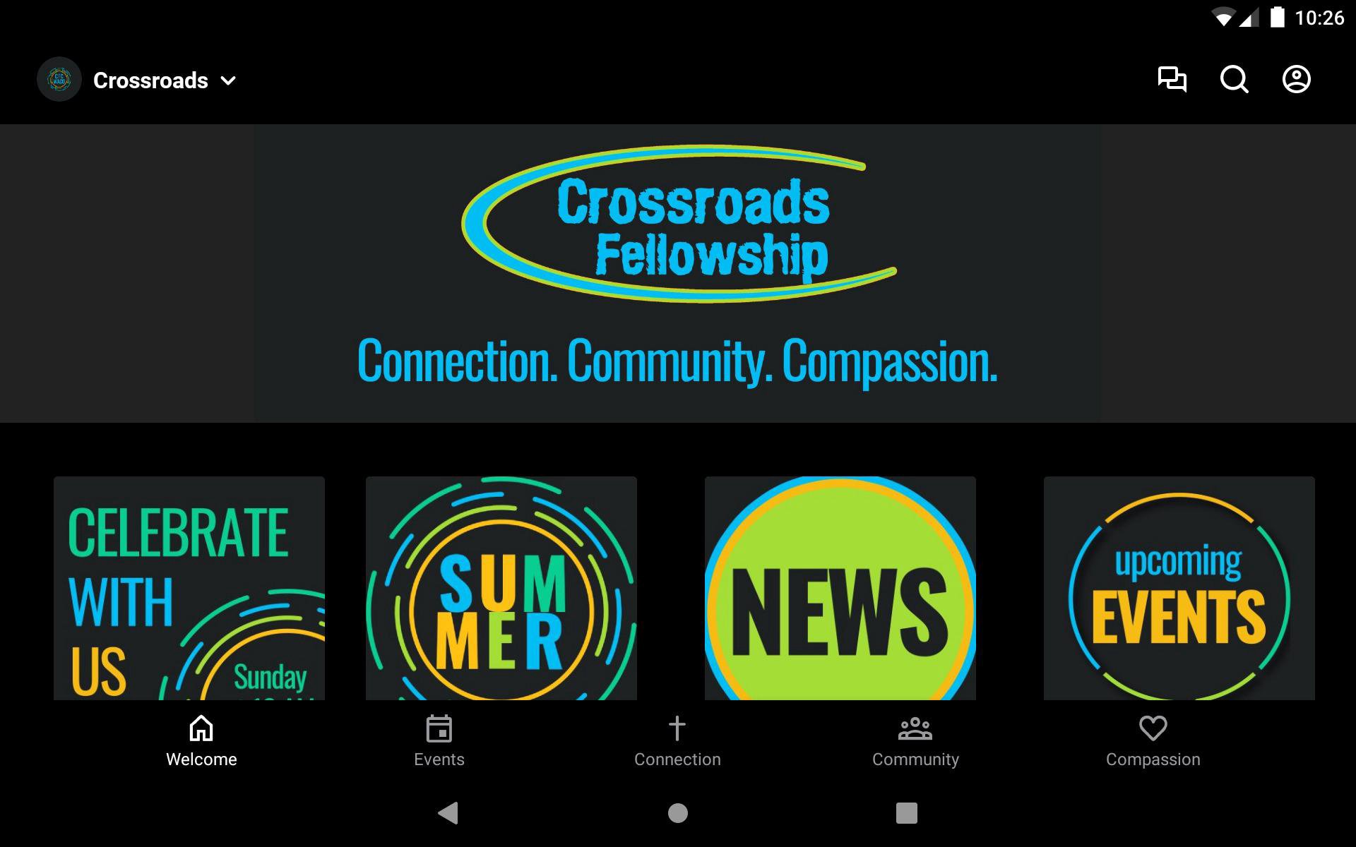The Crossroads app will help you stay connected with the day-to-day life of our church. With this app you can: watch or listen to past messages; stay up to date with push notifications; share your favorite messages via Twitter, Facebook, or email; and download messages for offline listening. The Crossroads app also has tools to help you easily connect with our small groups, manage your giving, and stay connected to God's Word!