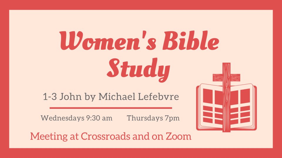 We will be studying 1-3 John by Michael LeFebvre, meeting two weeks on, one week off. See the Events page for exact dates. There will be two different meeting options: Wednesdays @9:30am or Thursdays @7pm. Both will be held at Crossroads and over Zoom. If you have any questions, please reach out to Sue Capelli or Jenn Seda. To purchase the book, click the link below: https://www.amazon.com/1-3-John-12-Week-Study-Knowing/dp/1433554895/ref=sr_1_1?crid=JW16IYSIY0H7&dchild=1&keywords=1-3+john+michael+lefebvre&qid=1630436510&sprefix=1-3+john+m%2Caps%2C148&sr=8-1