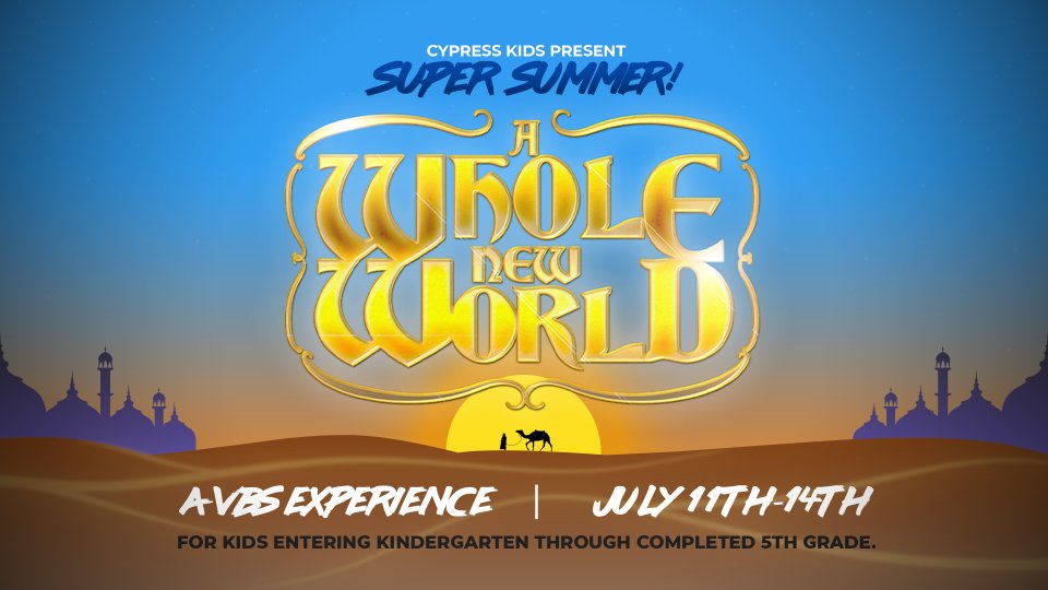 Super Summer: A Whole New World is a VBS experience for kids that are entering Kindergarten through completed fifth grade! Kids will join with a cast of outrageous characters to search for and discover the King of all kings through exciting games, engaging crafts, powerful worship, hilarious skits, and crazy competitions. Super Summer: A Whole New World will be your kids’ favorite event of the summer! The adventure will be at Cypress Baptist Church on July 11-14, 9am-12pm. Register early for the inside scoop and don’t miss a single moment of this FREE event!