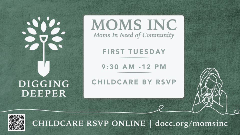 Moms INC (Moms In Need of Community) is for moms with children of all ages and stages of life. We strive to provide a Christ-centered time to build friendships, offering a place to share the joys and challenges of motherhood. As we build this community, let’s take our burdens, worries, and victories to the Lord and receive His peace together as a community of moms who love the Lord and pray together.