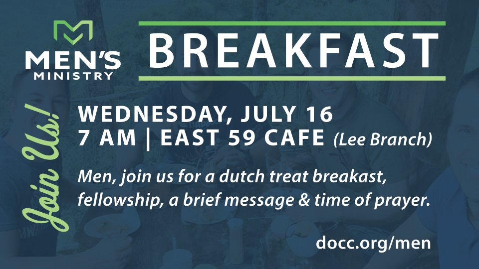 Men of all ages come join us for breakfast or just a cup of coffee as we gather as fellow believers seeking after the Lord’s will for our lives as men at DOCC. Our next Men’s Breakfast will be Wednesday, July 16 at 7 am at East 59 Cafe in Lee Branch (everyone covers the expense of their own breakfast).