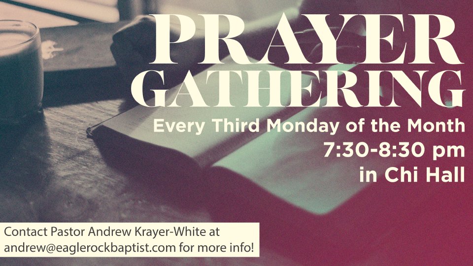 Join us as we pray for our church, our community and our world. We will be meeting on campus (in the downstairs of Chi Hall) on the third Monday of every month from 7:30-8:30 pm for a time of prayer. Come join us as we spend some time in prayer together!