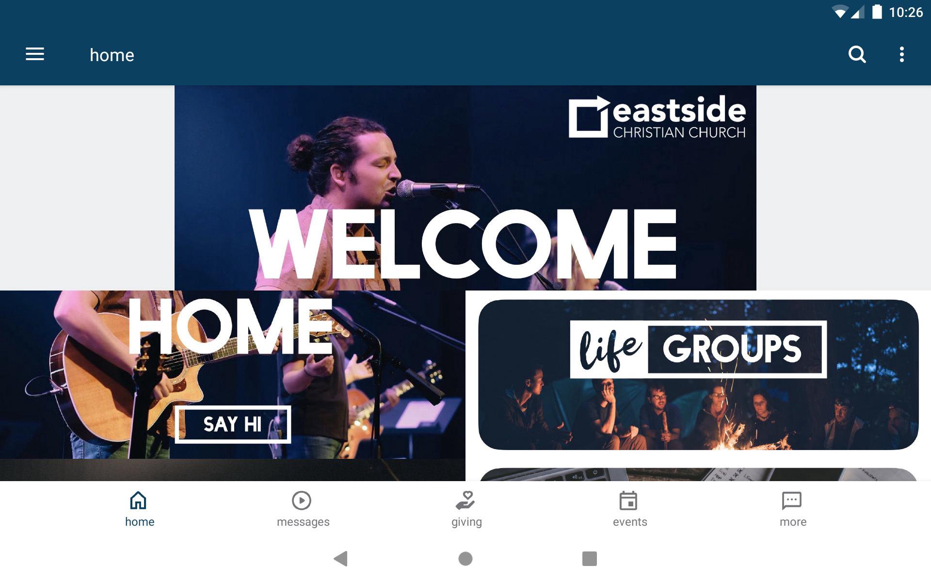 Welcome to the official Eastside Christian Church app. Keep up with message series, register for events, give and much more - all without leaving the Eastside app. So take a look around. We can't wait to see you for one of our weekend worship experiences some time soon!