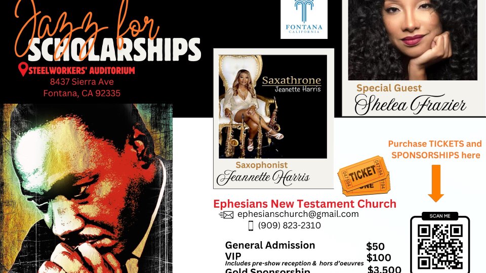 Ephesians New Testament Church commemorates 38 years of celebrating Dr. Martin Luther King Jr. by giving back to the youth in the City of Fontana. If you are interested in partnering with us by becoming a Gold or Platinum Sponsor, you will receive a special pre-show reception with delicious hors d'oeuvres, phenomenal jazz and advertising opportunities. Quick, act fast, limited seating!