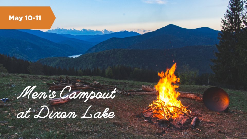 Gentlemen! Pack up your camping gear and come join us at Dixon Lake campground, Friday May 10-Saturday May 11. Come up just for the evening and have dinner or stay the night and enjoy breakfast too. $10 for just dinner, $20 for dinner, camping and breakfast. Kids are welcome for a flat $10 rate. Space is EXTREMELY limited, first come first serve.