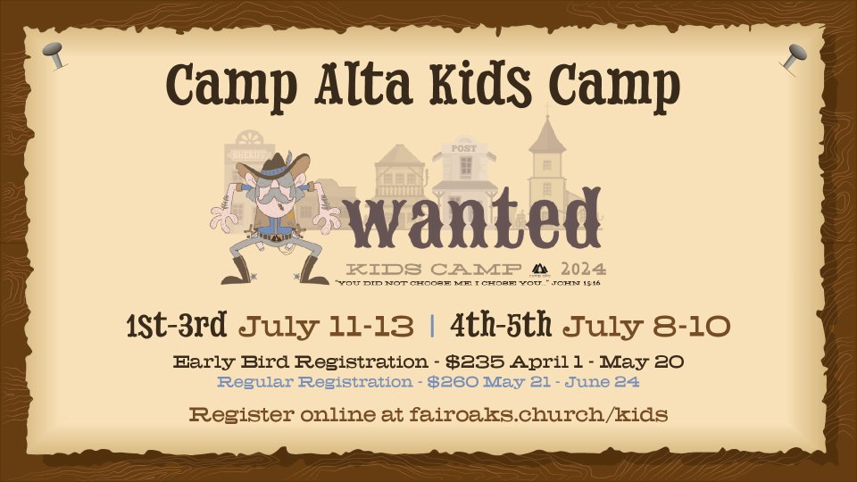 Kids Camp is a gospel centered overnight camp in a warm, genuine and engaging space for children to explore their relationship with God. Camp Alta is located about 1 hour from the church. Kids can expect engaging lessons related to our theme, recreation games, outdoor adventures, crafts, times of worship, exposure to the Bible, and cabin discussions with invested leaders and volunteers from our church family.