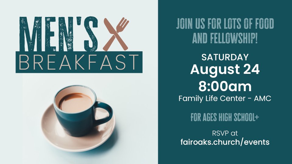 Calling all guys! We're getting together for monthly gatherings. This month we'll have breakfast together and build community. Join us on Saturday, August 24th from 8a-10a in the Family Life Center.
