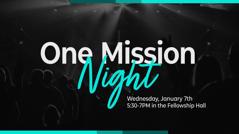 Join us for One Mission Night January 7th from 5:30-7. This will be a special family night as we come together as one church family! We’ll enjoy a time of fellowship, share supper together, create crafts for our teachers and members of our community, and spend time in prayer. We’ll close the evening by worshiping together as we lift our hearts to the Lord.
