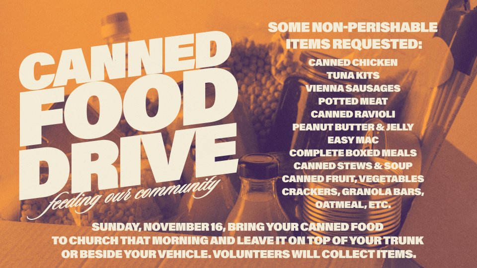 Sunday, November 16, bring your canned food to church that morning and leave it on top of your trunk or beside your vehicle. Volunteers will collect items. Food is needed that has protein and is ready to eat, as many have access to nothing but a microwave; if that.