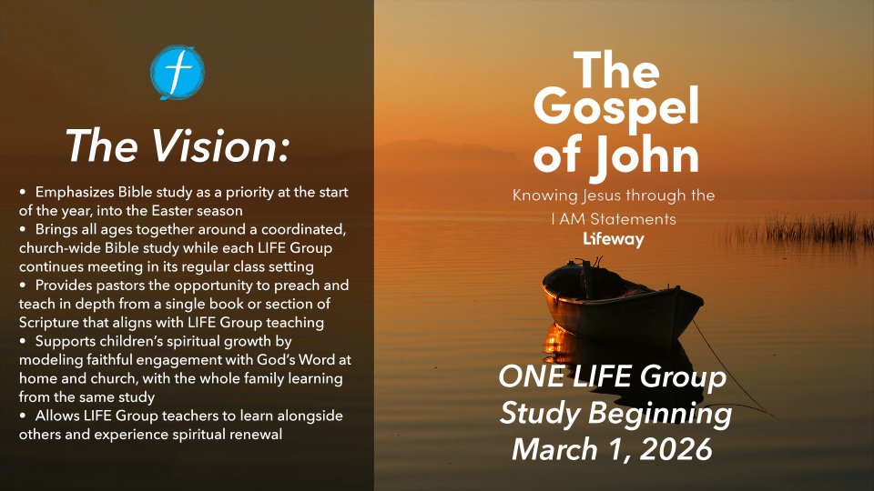 Beginning the first Sunday in March, we’ll launch a One LIFE Group Study that will lead us together through Scripture surrounding the “I AM” statements into the Easter season. All ages will follow the same Bible study, while each LIFE Group continues meeting as usual in its regular class. Our pastors’ teaching will align with LIFE Groups, helping families grow together through shared engagement with God’s Word.