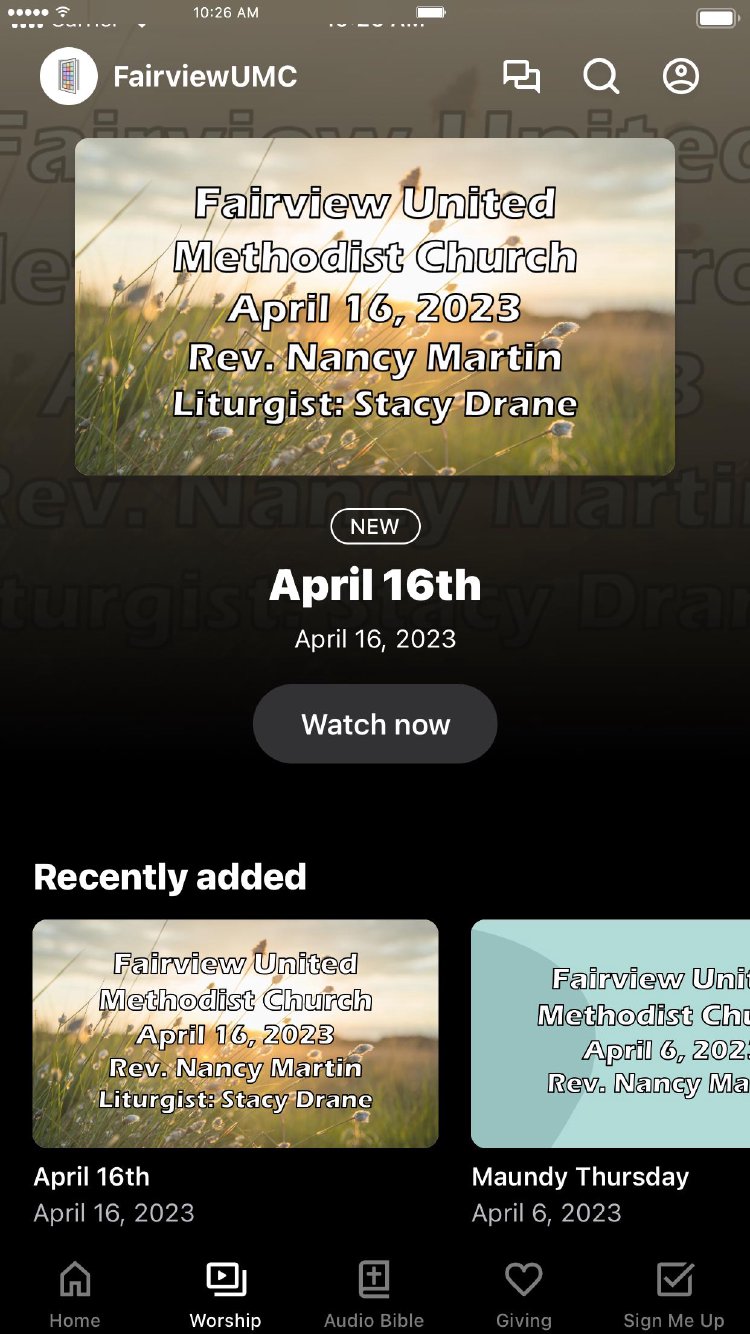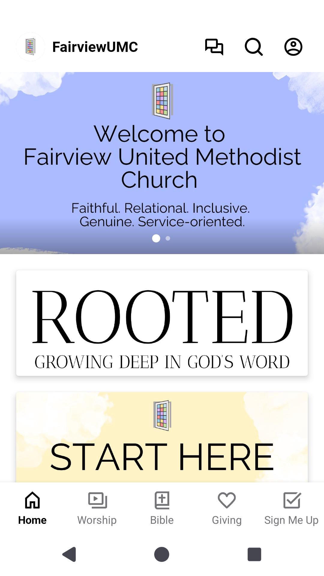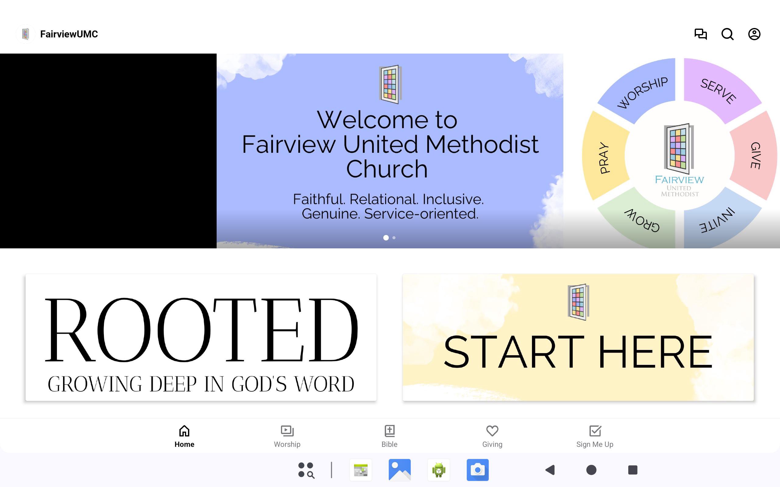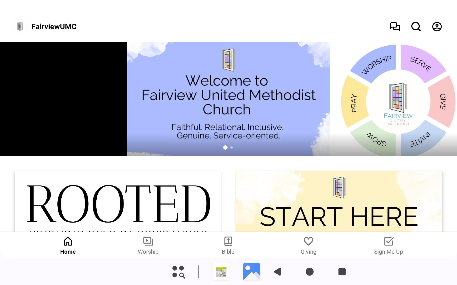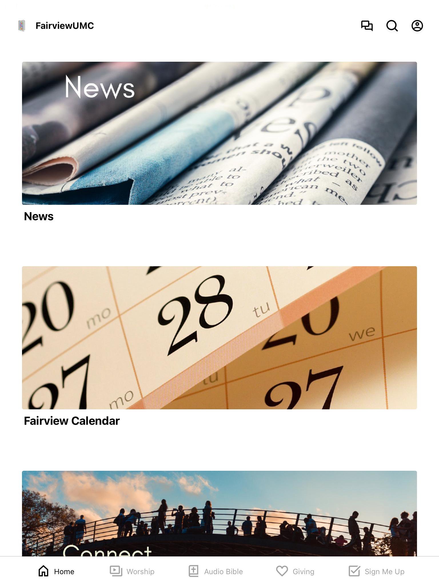 This app will help you stay connected with the day-to-day life of Fairview United Methodist Church. With this app you can: watch or listen to past worship services; stay up to date with push notifications; participate in small groups; give online; read and listen to the Bible; volunteer to serve; and signup to participate in various events.