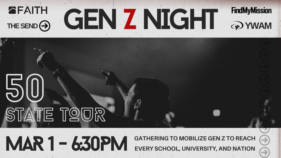 50 STATE TOUR We're believing for an awakening among our generation! We want to see GenZ and Gen Alpha connected to their purpose and activated into a fully surrendered life. We are calling our generation to shift culture by getting back to true, Jesus-centered Christianity. We want our generation to join us on the front lines of the next Jesus movement. This is your permission slip to go. We're partnering up with some awesome people and organizations to open up the doors for you to chase after the vision of Jesus in your school, university, and the nation! Partners include: • Jesus Clubs - thejesusclubs.com • Claim Your Campus - claimyourcampus.com • YWAM Kona - ywamuofn.org • The Send - thesend.org • Find My Mission - findmymission.org • Circuit Riders - circuitriders.com • Carry the Love - carrythelove.com