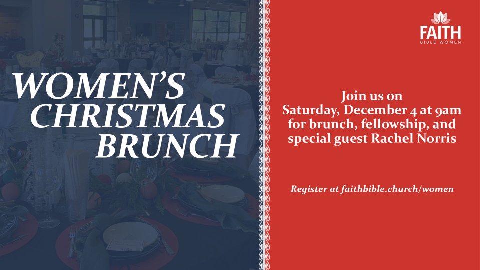 Faith Women is kicking off the 2021 holiday season with our annual Women’s Christmas Brunch! Join us in the church foyer on Saturday, December 4 for brunch, fellowship, and a special message in the worship center from guest speaker Rachel Norris. Doors open at 9:00am and brunch begins at 9:30am. Cost is $20 per person. This is a “ladies only” event and no childcare is provided. Please register by November 28.