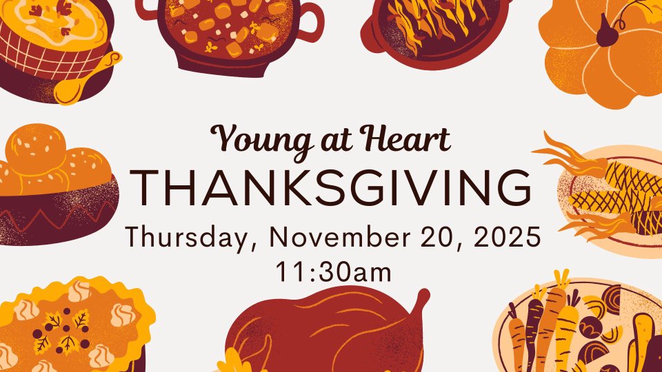 Join us for a wonderful afternoon with the Young at Heart group - a time for those 55 and older to enjoy delicious food, great company, and plenty of laughter! We'll share a traditional Thanksgiving feast complete with turkey, stuffing, mashed potatoes, and of course, everyone's favorite pies!