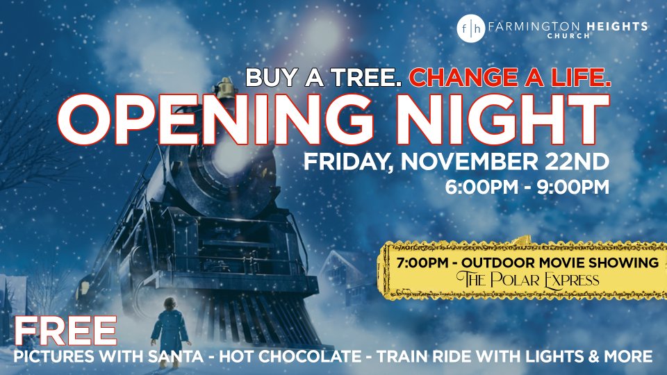 Join us for the opening night of our 2024 tree lot, 6:00PM-9:00PM. We'll have free hot chocolate, pictures with Santa, a train ride and more! At 7:00PM we'll be showing The Polar Express outdoors on the big screen! Bring a lawn chair to sit on and invite a friend to purchase their Christmas tree at Farmington Heights.