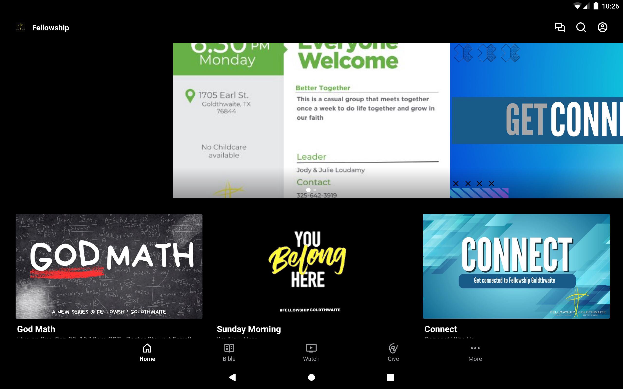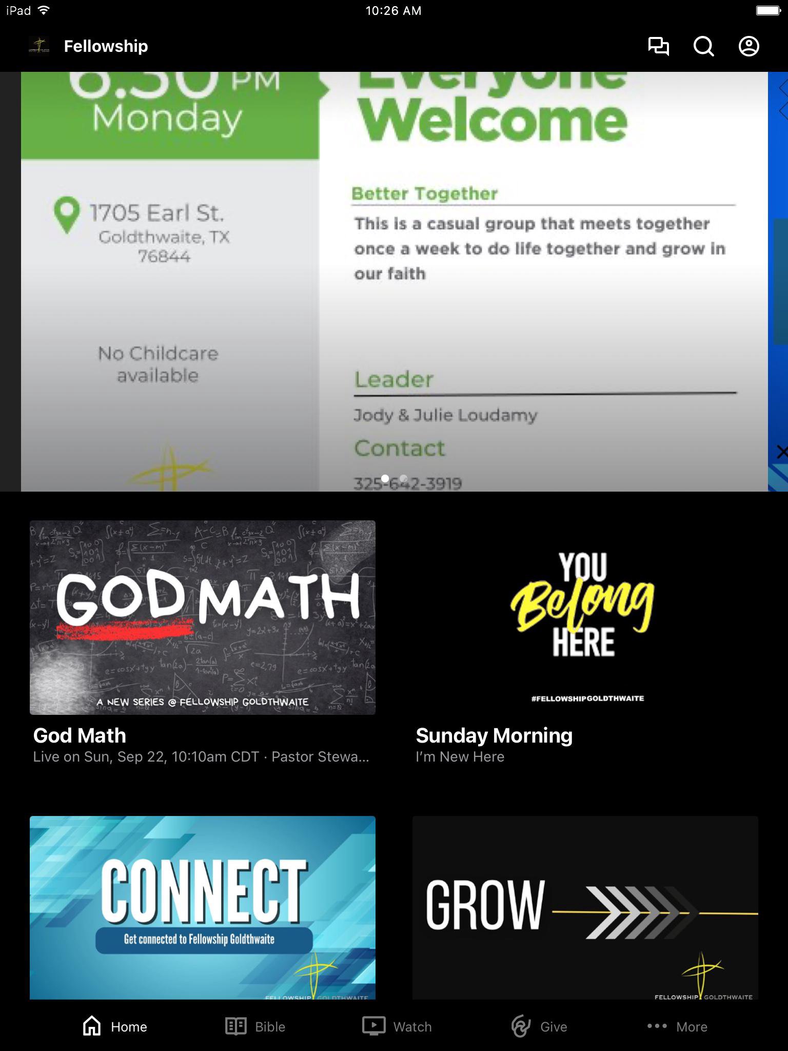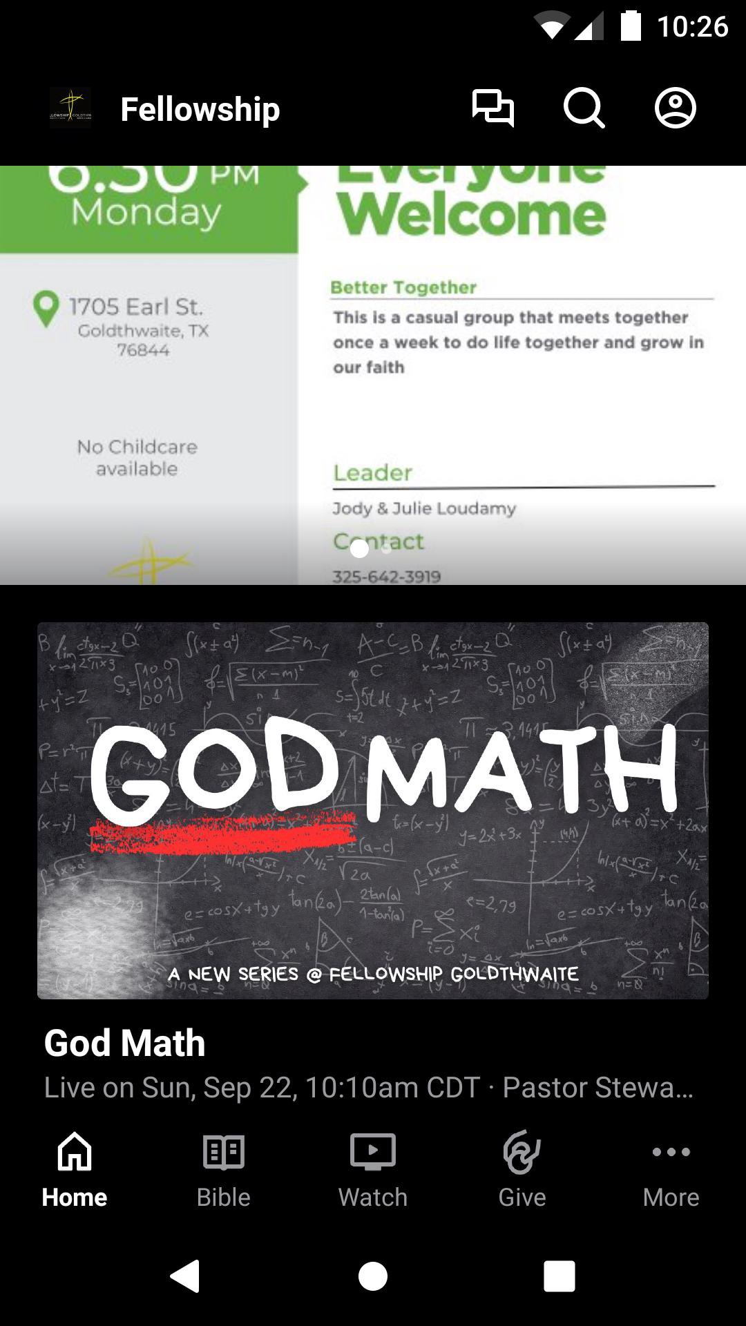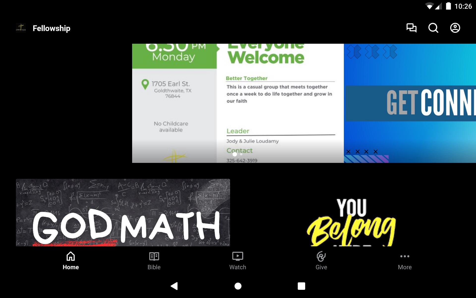 The Fellowship Goldthwaite App features content from our Church in Goldthwaite, Texas. At Fellowship we are a community of believers of all different ages and from different walks of life, that gather together to Connect, Grow, Serve, and Share the Love of Jesus. We have a heart for Goldthwaite and want to make a difference by Building Lives that Honor God. SPECIAL FEATURES: * Podcast: Listen to the latest sermon or lookup a previous one in the podcast library * Digital Bible: Enter the passage you want or use quick keys to go directly to the passage you desire to read * Free Audio Bible: Click listen and you are instantly listening to the daily devotional plan. You can also look up any passage you want, the listen tab is in the bottom left hand corner at all times. SOCIAL INTEGRATION: Share content with your friends via Twitter, Facebook or email. * Facebook: you can share a Bible passage, journal entry or anything in the app with one click. * Twitter: You can tweet a Bible passage, reading plan, journal entry or just a note with ease. PURSUE JOURNAL: * Daily Bible Reading Plan: The Pursue Bible reading plan takes you through the Old testament once a year and through the New Testament twice a year. Average Reading or listening time is 15 minutes a day. * Free Customizable Journal: The pursue Journal is designed to give you the freedom to journal whenever and however you desire. Entries are fully secure for your privacy, yet at any time you can share them via Facebook, Twitter or email. * Cloud Based Journal: Your Pursue Journal is accessible online anytime at www.Pursuejournal.com. This allows you to be able to add entries anywhere, anytime and they are automatically linked to your Fellowship Goldthwaite App. WiFi Internet is required for some devices For more information about Fellowship Goldthwaite, please visit fellowshipgoldthwaite.com For more information about Pursue Journal, please visit pursuegod.com
