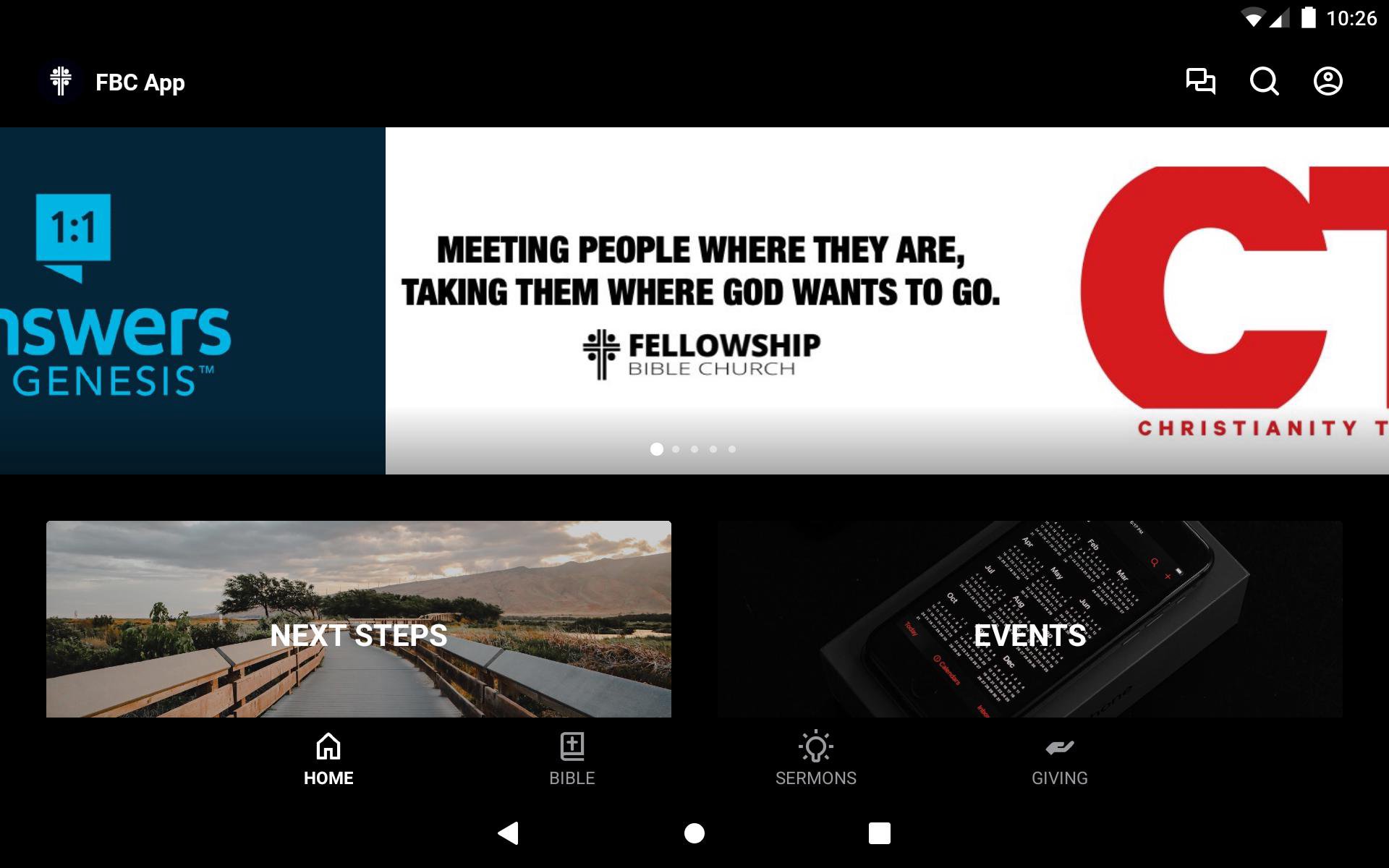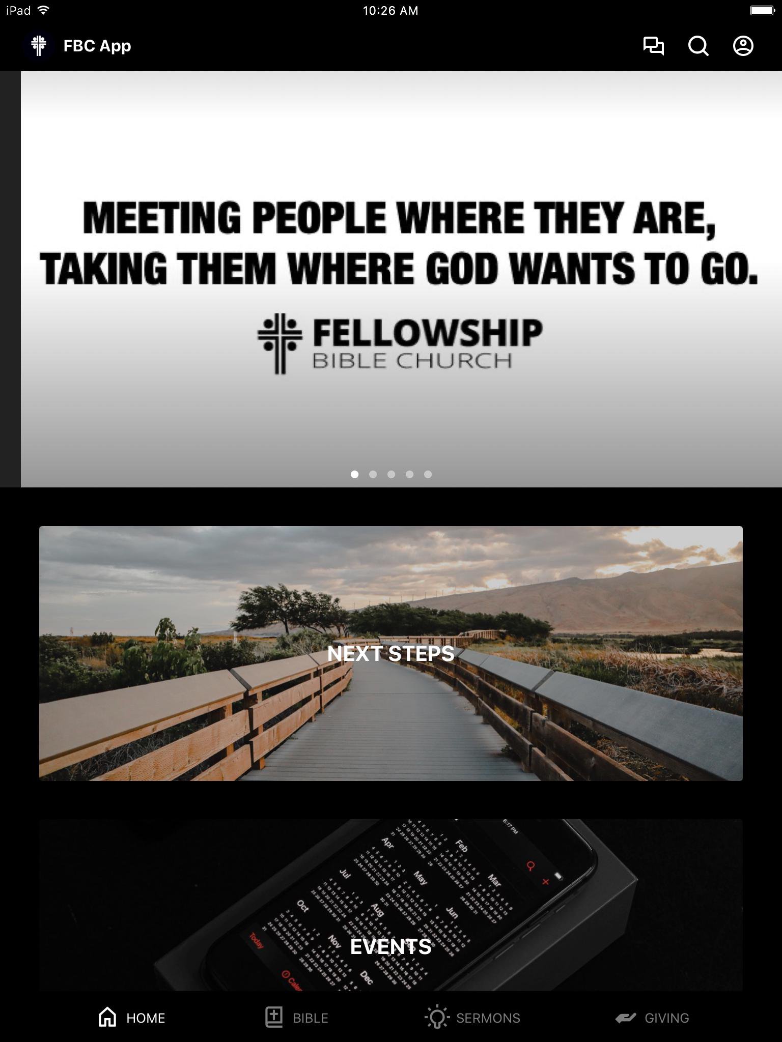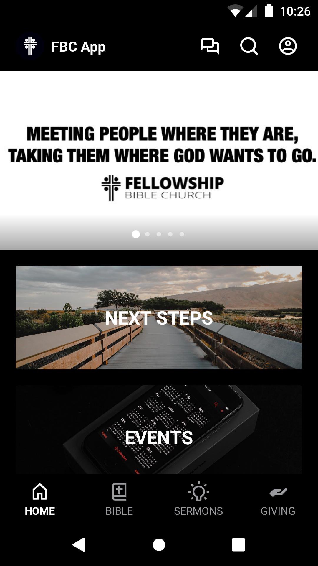 This app will help you stay connected with the day-to-day life of Fellowship Bible Church. With this app you can: watch or listen to past messages; stay up to date with push notifications; share your favorite messages via Twitter, Facebook, or email; and download messages for offline listening.