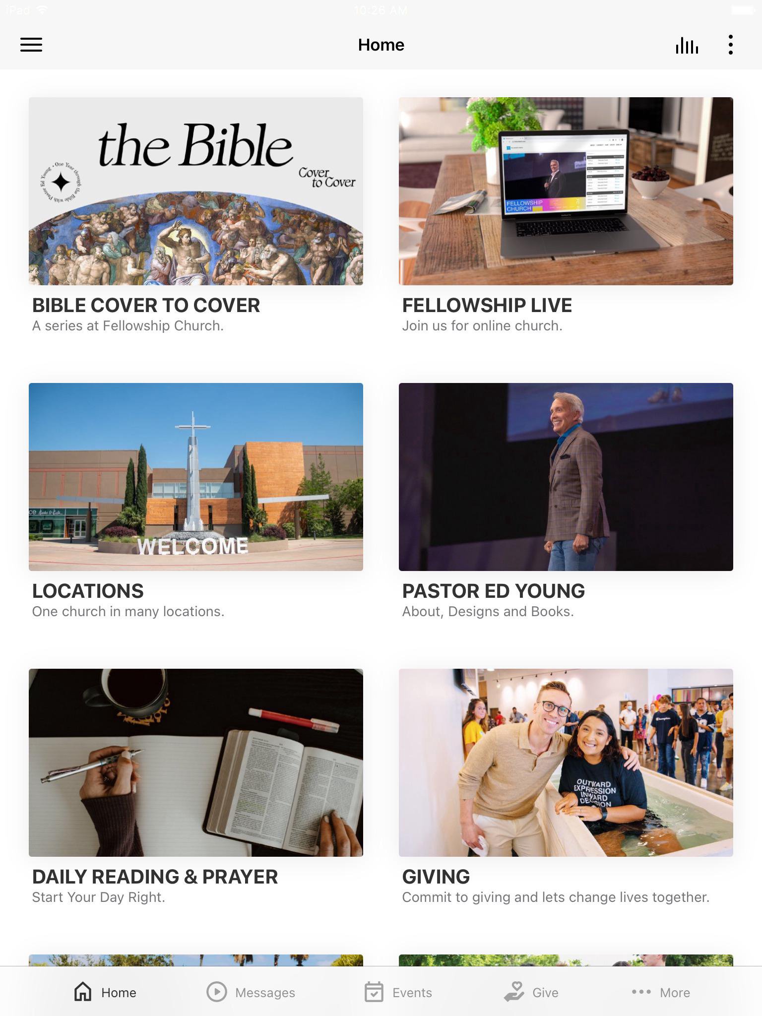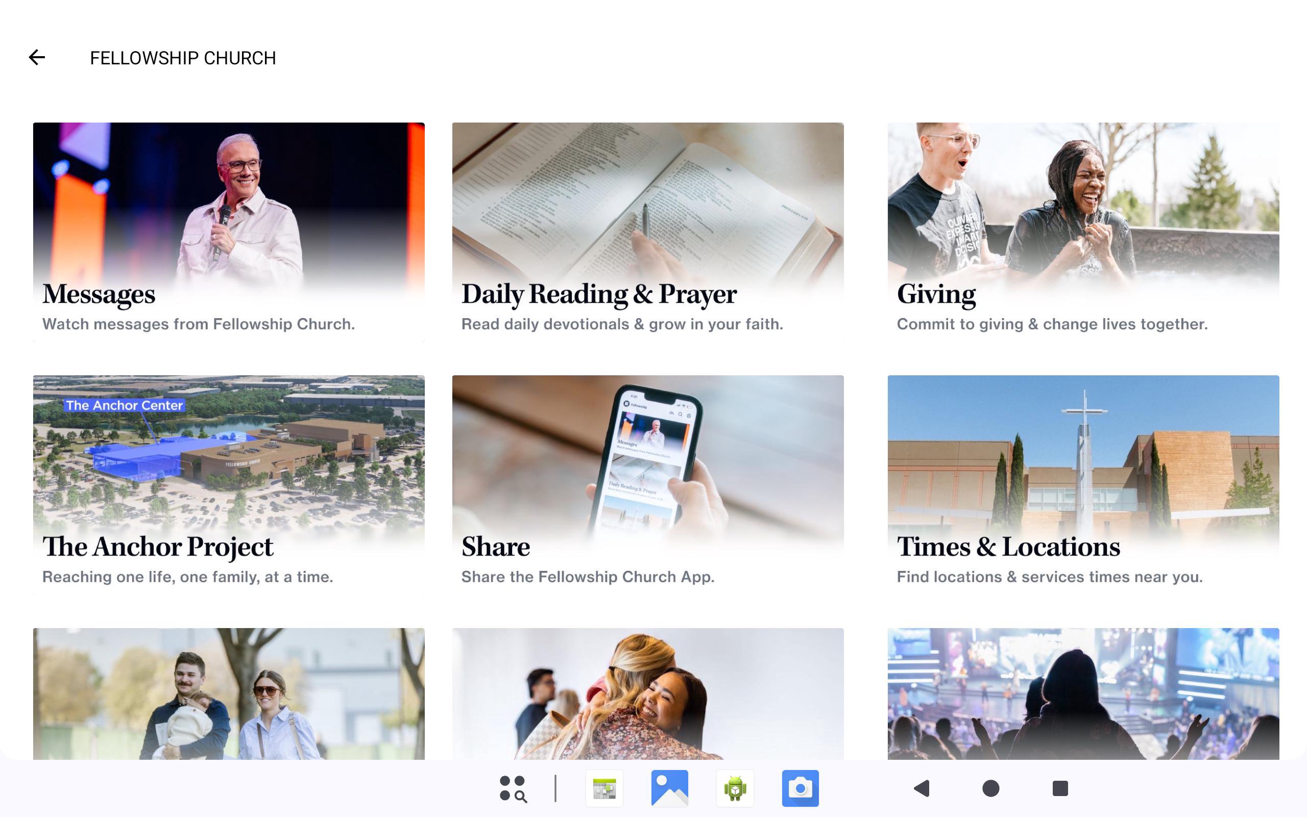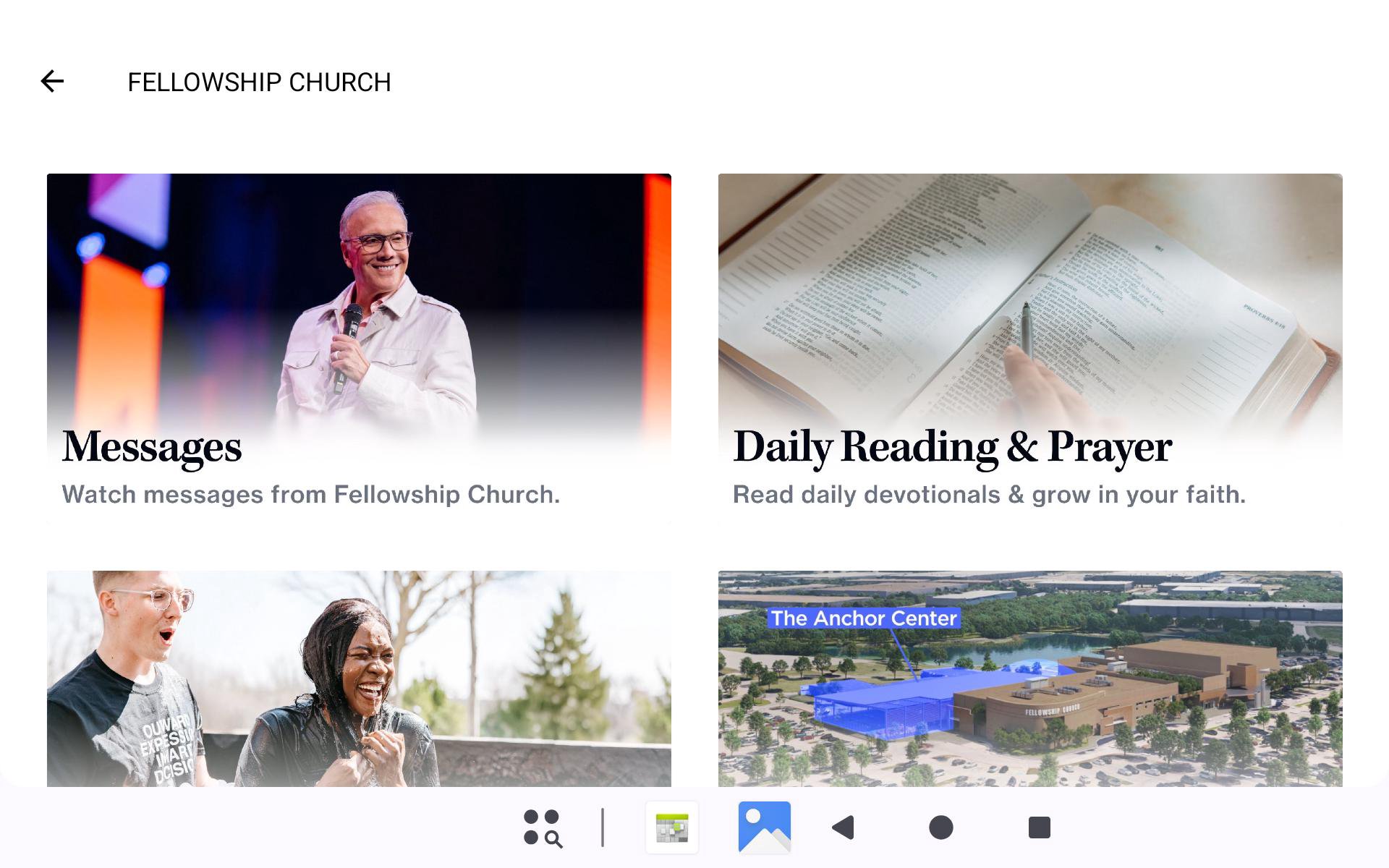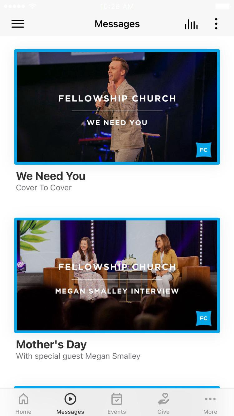 Bring all of the excitement of Fellowship Church to the palm of your hand with the FC mobile app. With this app, you'll be able to stay connected to Ed and Lisa as well as have up-to-date information on the latest and greatest things going on at Fellowship Church. Whether you’re a first-time visitor or regular attendee, this is a helpful and informative app for you! Features: - Get information specific to the campus you attend - Watch and Listen to the latest messages as well as select past series - Always stay in touch with push notifications - Share the latest messages with your friends on Twitter and Facebook - Find out worship experience times in your area - See current series and the latest ministry information - Get directions to the campus of your choice - Follow Fellowship Church and Pastor Ed and Lisa Young on Facebook and Twitter - Download albums from Fellowship Creative