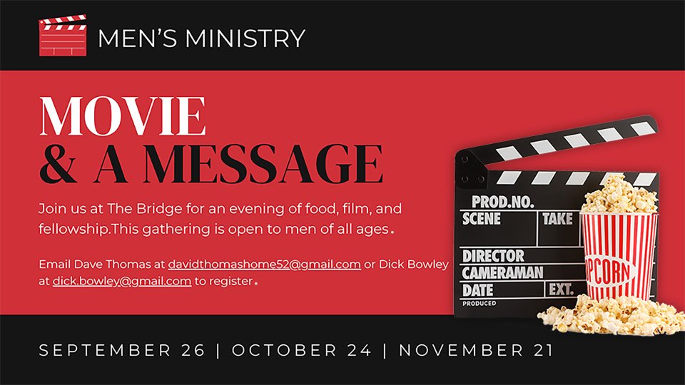 Join First Men at The Bridge for an evening of food, film, and fellowship. Hosted by Dave Thomas and Dick Bowley, this gathering is open to men of all ages—both church members and guests. The meal begins at 6pm with the movie beginning at 7pm.